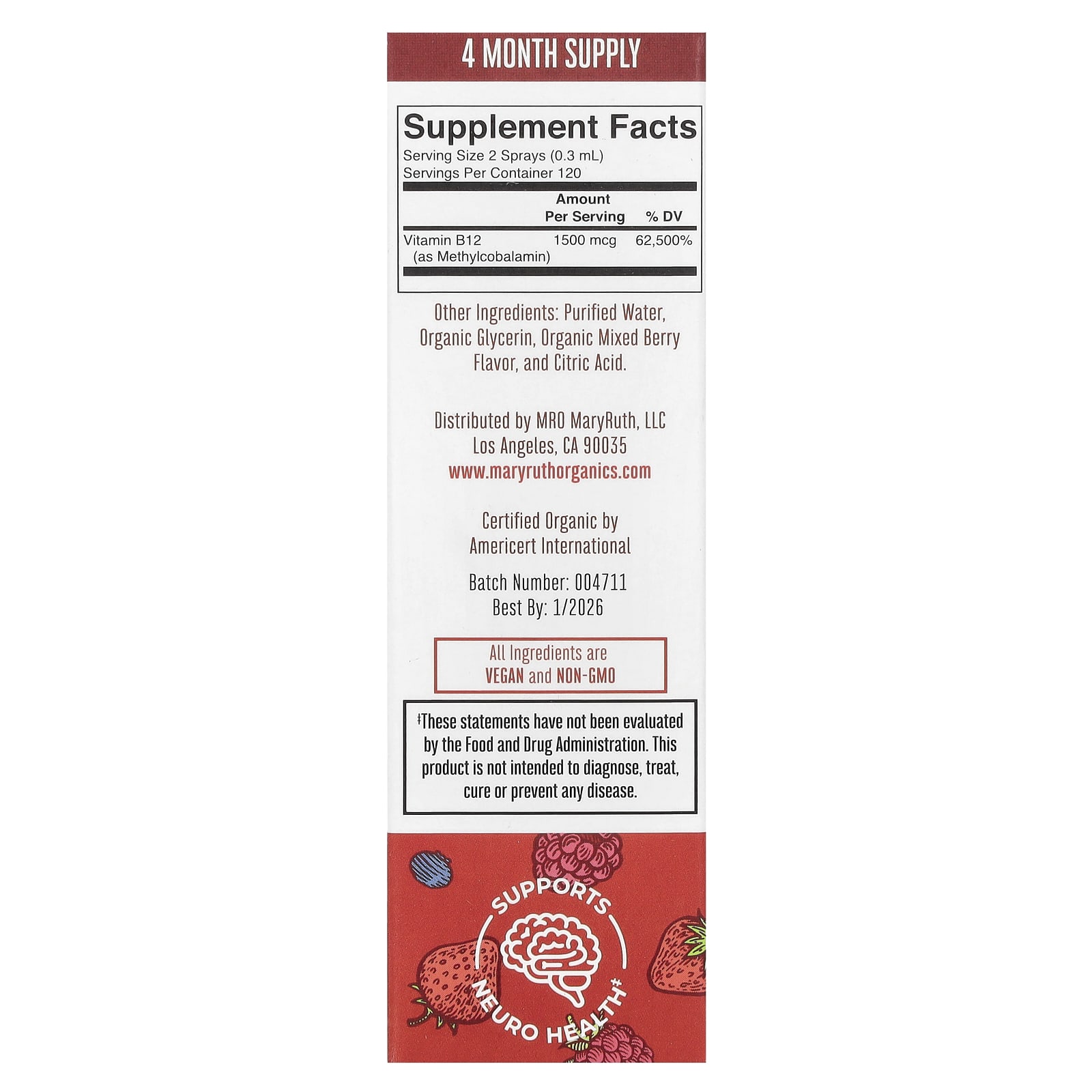 Reforce seu cérebro, sistema nervoso e glóbulos vermelhos com este delicioso spray de B12 vegano de frutos silvestres. Mantenha os níveis normais de energia do seu corpo e a saúde do cérebro reforçando a saúde neurológica com um saboroso spray de frutos silvestres.