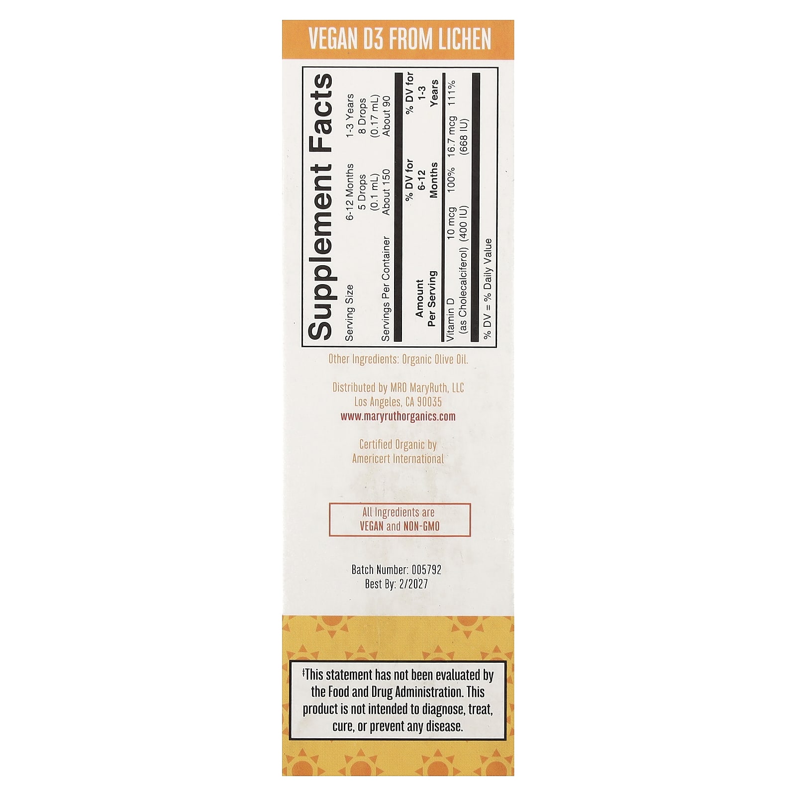 MaryRuths Vitamina D3 Orgânica em Gotas para Bebês e Crianças Pequenas A Partir de 6 Meses Sem Sabor 15 ml (05 fl oz) – MaryRuth’s Bebês e Crianças Saúde Infantil Vitaminas para Crianças Vitamina D para Crianças.