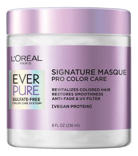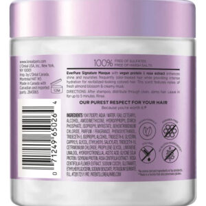 A máscara L'Oreal Paris EverPure Signature com proteína vegana e extrato de rosa realça o brilho e nutre os cabelos frequentemente tratados com cores, ao mesmo tempo que fornece hidratação intensa para cabelos coloridos com aparência revitalizada. NOSSO MAIS PURO RESPEITO PELO SEU CABELO — 100% sem sulfato, sem parabenos, sem corantes, sem glúten e vegano. Validado por coloristas de cabelo. *Porque você vale a pena *Validado por uma equipe interna especializada de coloristas de cabelo profissionais com extensos testes presenciais.