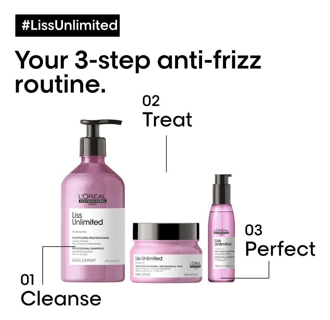 Máscara L'Oreal Professionnel Liss Unlimited | Para cabelos propensos ao crespo | Oferece proteção duradoura contra o frizz e a umidade | Com proqueratina | 8,5 fl. Oz. – Máscara antifrizz: nutre e suaviza intensamente o cabelo com frizz e proteção contra umidade. – Benefícios: evita o crespo e facilita a secagem. – Benefícios adicionais: a proqueratina fortalece o cabelo, deixando-o macio, suave e brilhante. – Coleção Liss Unlimited: Para obter melhores resultados, recomendamos lavar com o shampoo Liss Unlimited e tratar com o sérum Blow-Dry. – Uso sugerido: Após a lavagem com o Shampoo Liss Unlimited, aplique uniformemente no cabelo lavado, deixe agir por pelo menos um minuto e depois enxágue bem.