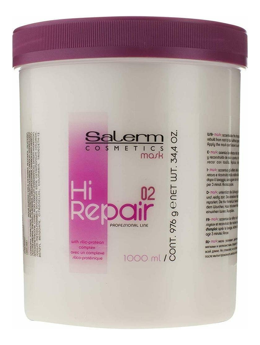 Máscara Salerm Hi Repair com complexo de proteína de sílica 02, 34,4 onças – Salerm Hi repair Mask 02 é uma máscara reconstrutiva de ação imediata que acentua os efeitos do shampoo Hi Repair – Sua fórmula sequencial do sistema de tratamento capilar é capaz de devolver as constantes corretas aos cabelos desidratados, com deficiências de água, defeitos na estrutura interna do córtex e falta de nutrientes – O cabelo é reconstruído da raiz às pontas, deixando sem resíduos oleosos – A máscara Hi Repair repara a cutícula do cabelo graças aos seus componentes hidratantes e reparadores – Como usar: Depois lave, seque o cabelo com uma toalha e aplique a máscara Hi Repair; deixe agir por 3 minutos