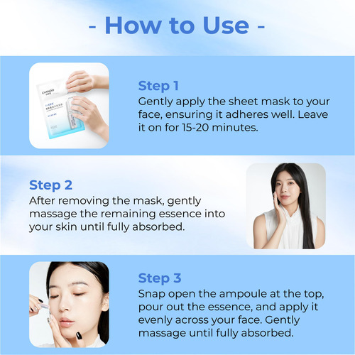 Como usar: Etapa 1: aplique suavemente a máscara de lençol no rosto, garantindo que ela adira bem. Deixe agir por 15 a 20 minutos. Etapa 2: Depois de remover a máscara, massageie suavemente a essência restante na pele até que seja totalmente absorvida. Etapa 3: Abra a ampola na parte superior, despeje a essência e aplique uniformemente no rosto. Massageie suavemente até ser totalmente absorvida.