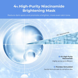 – Aumento de brilho de alta eficiência: formulada com 4% de niacinamida e água glacial, esta máscara penetra profundamente na pele, reduzindo efetivamente as manchas escuras e melhorando o brilho natural da pele a cada uso.