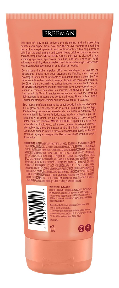 Máscara Freeman Clearing Peel-Off de argila, máscara facial iluminadora e tonificante, chá e limão ajudam a uniformizar a pele, rica em antioxidantes, máscara facial de argila para erupções cutâneas, livre de crueldade e vegana, tubo de 175 ml, 1 unidade — A máscara facial Freeman Clearing Peel-Off Clay é nossa máscara facial de chá doce e limão que atua como máscara de argila absorvente de óleo e tonificante. Limpe as impurezas e ilumine a pele opaca – Ingredientes para a pele, como chá e limão, protegem e limpam a pele. O chá é rico em antioxidantes para ajudar a proteger a pele e o limão ajuda a clarear as manchas escuras para uma tez radiante – Fácil de usar – basta aplicar uma camada fina na pele limpa e seca. Evite a área dos olhos, as sobrancelhas, a linha do cabelo e os lábios. Deixe agir por até 15 minutos e retire com cuidado. Enxágüe com água morna. Use sempre que necessário – Freeman acredita que os cuidados com a pele pertencem a todos e se esforça para democratizar a beleza fornecendo produtos acessíveis para a pele sem comprometer a qualidade. Faça até 12 utilizações por tubo de máscara de 6 onças — A máscara facial peel-off é perfeita para peles normais e mistas. A argila ajuda a desintoxicar, limpar e eliminar erupções cutâneas sem ressecar demais a pele. Interrompa o uso se ocorrer irritação – Feitas com ingredientes limpos, livres de parabenos, sulfatos, silicone, ftalatos e óleos minerais – Máscaras faciais sem produtos químicos agressivos e 100% livres de crueldade e veganas – os produtos Freeman nunca são testados em animais