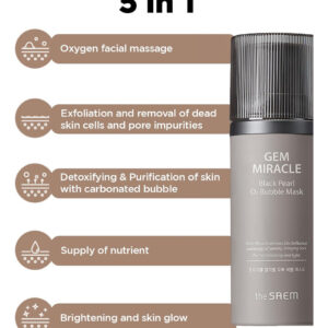 Experimente Pearl-Great Radiance Abrace o segredo de uma pele brilhante e radiante com a máscara Gem Miracle Black Pearl O2 Bubble da THESAEM. Este produto exclusivo para a pele não é uma máscara facial comum. É um caminho genuíno para obter uma luminosidade semelhante a uma pérola, alimentada pela capacidade purificadora dos extratos de pérolas e do oxigênio. Sua fórmula engenhosa de gel a bolha funciona acordando sua pele e massageando suavemente, revelando uma pele fresca e úmida por baixo. Confie em nós; você não vai querer perder a transformação de um gel preto macio em bolhas de O2 efervescentes — é o seu espetáculo pessoal de cuidados com a pele! – REVOLUCIONE SUA ROTINA DE CUIDADOS COM A PELE: adote os cuidados com a pele coreanos com a máscara Gem Miracle Black Pearl O2 Bubble. Sua fórmula exclusiva de gel macio se transforma em uma máscara de bolha de O2, oferecendo uma massagem facial com oxigênio. Uma solução especial intensiva para a pele facial, ela dá vida à pele opaca e áspera com uma massagem revigorante com microbolhas de oxigênio – ALCANCE UM BRILHO DE PÉROLA: Como o nome sugere, esta máscara de bolhas de O2 de pérola ajuda a obter uma pele brilhante como uma pérola radiante. Sua textura de gel preto é fácil de usar, o que o torna uma boa adição à sua rotina. O extrato hidrolisado de pérola, rico em minerais e aminoácidos, promove uma pele saudável – SOLUÇÃO 5 EM 1 para a pele: mais do que apenas uma máscara de lavagem, esse milagre de limpeza da pele oferece 5 propriedades benéficas. Suas características 5 em 1 incluem massagem facial com oxigênio, esfoliação, purificação dos poros, nutrição e brilho. Faça disso parte de sua rotina diária de cuidados com a pele abrangentes – INGREDIENTES NATURAIS PODEROSOS: Formulados com ingredientes naturais poderosos, como extrato de pérola hidrolisado, pantenol, oxigênio e extrato de mamão. Eles trabalham juntos de forma sinérgica para tratar a pele irritada e escura e os poros dilatados. A máscara deixa sua pele brilhante e radiante como uma boa pérola – CONFORTÁVEL E FÁCIL DE USAR: Para obter os melhores resultados, aplique uma quantidade adequada na pele seca. A máscara de bolha Gem Miracle Black Pearl O2 foi projetada para ser fácil de usar e eficaz. Testemunhe o luxo e a eficácia desta máscara de limpeza facial com brilho e brilho para a pele fazendo sua mágica