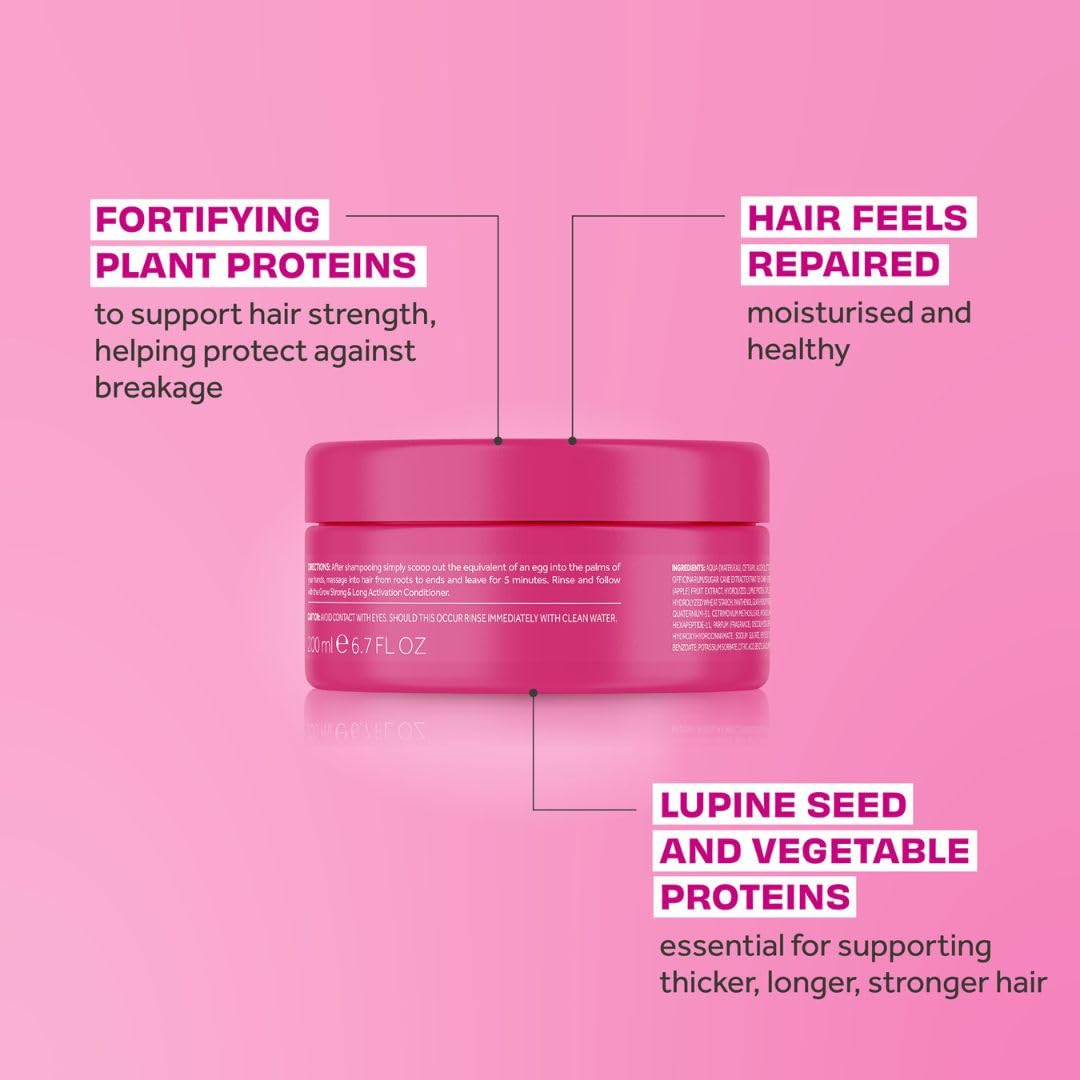 Não é necessário fazer grandes esforços para impedir que o cabelo se quebre. A máscara de tratamento de ativação Lee Stafford Grow Strong & Long original protege você, fornecendo umidade intensa às madeixas secas e danificadas para condicionar e fortalecer por dentro. Esta máscara cremosa e nutritiva agora é feita com o dobro do complexo Lee Stafford PRO-GROWTH, além de uma mistura exclusiva de sementes de tremoço e proteínas vegetais à base de plantas para ajudar o cabelo a ficar mais forte com o tempo e menos propenso a quebras. – THE LOWDOWN. Esta máscara mais vendida hidrata profundamente o cabelo e o couro cabeludo, fortalecendo e reparando para estimular o crescimento saudável do cabelo. – POR QUE VOCÊ VAI ADORAR. É intensamente hidratante e ajuda a fortalecer cada fio de cabelo de dentro para fora. – COMO FUNCIONA. Apoiando o cabelo e o couro cabeludo, para um cabelo mais saudável e forte. – STAR INGREDIENTS. Adicionamos o extrato de tremoço hidrolisado Superpower para melhorar a força do cabelo. – É CERTO PARA MIM? se seu cabelo estiver propenso a quebrar, essa máscara pode ajudar a aumentar a força e o comprimento. – OS RESULTADOS. Cabelo mais saudável, mais forte e com menos quebras, ajudando o cabelo a crescer mais e mais forte com o tempo.