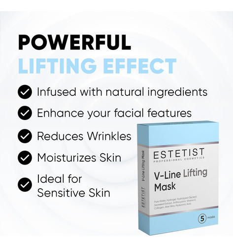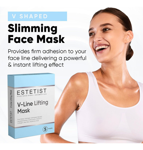 Esculpa, levante e hidrate com a máscara elevatória ESTETIST V Line; sua solução caseira para uma mandíbula mais fina e firme. Esta máscara facial adelgaçante em forma de V foi projetada para contornar a metade inferior do rosto, ajudando a reduzir a aparência de queixo duplo e pele flácida sem tratamentos invasivos ou visitas ao salão de beleza. Formulada com uma mistura que adora a pele de ácido hialurônico, colágeno, aloe vera, extrato de algas marinhas e vitamina E, cada máscara oferece hidratação profunda enquanto melhora a elasticidade e o tom da pele. O resultado? Um perfil visivelmente levantado e mais jovem com uma pele mais lisa e firme. O design macio e elástico do nosso adesivo de elevação de queixo e pescoço comprime suavemente a linha da mandíbula para apoiar o aperto e reduzir o inchaço. Basta aplicar o cinto de emagrecimento facial após a limpeza e deixá-lo fazer sua mágica por 20 a 30 minutos; sem bagunça, sem problemas. Cada caixa inclui 5 adesivos faciais reafirmantes descartáveis, facilitando a manutenção dos resultados com o uso regular. Esteja você se preparando para um grande evento ou aumentando sua rotina antienvelhecimento, a máscara facial ESTETIST V Line oferece resultados de qualidade de salão no conforto de sua casa.