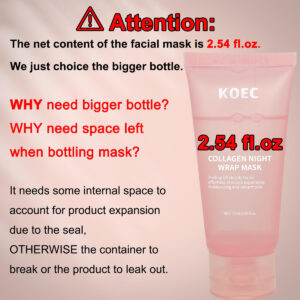 Máscara noturna multiação Esta máscara noturna de colágeno nutre e repõe profundamente a umidade da pele, restaura o equilíbrio da umidade, melhora a firmeza da pele, ajuda a minimizar a aparência de linhas finas e rugas enquanto restaura a elasticidade – Desperte seu brilho. Nossa máscara envolvente de colágeno acalma e nutre profundamente a pele durante a noite, estimula o ciclo de renovação noturna da pele, acorde com brilho e brilho pele – Não se preocupe, o conteúdo líquido é de 2,54 fl.Oz. Nosso item requer algum espaço interno para compensar a expansão do produto devido ao aumento da temperatura, caso contrário o recipiente se romper ou o produto vazar. Então escolhemos uma garrafa maior. Mas o conteúdo líquido da máscara é de 2,54 fl.oz. – Máscara noturna multiação Esta máscara noturna de colágeno nutre e repõe profundamente a umidade da pele, restaura o equilíbrio da umidade, melhora a firmeza da pele, ajuda a minimizar a aparência de linhas finas e rugas enquanto restaura a elasticidade – Descasque inteira, limpa e arrumada. Esta máscara também ajuda a bloquear o hidratante, não permite que ele se transfira no travesseiro, seu cabelo não grudaria no rosto, fácil de manter tudo arrumado até a manhã. – Fácil de usar. Após a limpeza, aplique uniformemente sobre o rosto como última etapa do cuidado da pele, evitando a área dos olhos e lábios, espere 15 minutos até secar completamente e depois vá para a cama. Na manhã seguinte, retire suavemente a máscara nas bordas externas inferiores do rosto, para obter uma pele mais firme e resistente