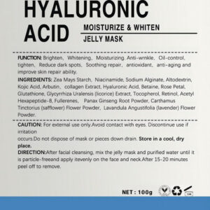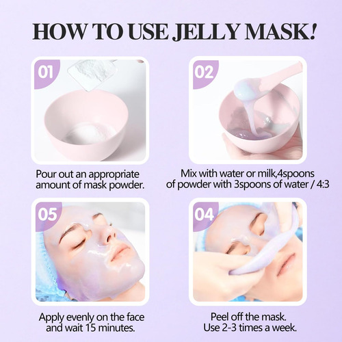 Máscara facial pura e natural para o cuidado da pele: não contém nenhum material industrial, adequado para todos os tipos de pele, sem parabenos ou óleo mineral, as máscaras de gelatina são feitas principalmente com alginato refinado. Manutenção com confiança. – Máscara de gelatina em pó Fokiabin de 35 onças: A máscara de gelatina é feita principalmente de extratos naturais refinados de alginato e ácido hialurônico. Nossa máscara de gelatina em pó não contém argila, óleo mineral ou aditivos e não conduz experimentos com animais. E a máscara de gelatina em pó é fornecida na forma de pacotes de pó que assumem a forma de uma máscara de gelatina quando é adicionada água purificada. Agora desfrute de um tratamento facial profissional com máscara de gelatina no conforto de sua casa com nosso kit de máscaras faciais Jelly Mas – Jelly Face Mask Home Spa: 9 sabores de máscara de gelatina em pó por 100 g de sacos, incluindo lavanda, rosa, ouro de 24 quilates, ácido hialurônico, melaleuca, aloe vera, açafrão, vitamina C, carvão de bambu, lavanda, com espátula com rolo e tigela de jade. Com nossa máscara facial de gelatina em pó, você também pode desfrutar de uma máscara facial de gelatina profissional para cuidados com a pele facial e uma experiência de spa em casa. Pode ser um presente perfeito, presente de Natal, presente de Dia dos Namorados, nossa máscara de gel definitivamente os surpreenderá: a máscara de gelatina melhora a pele: máscaras de gelatina para profissionais ajudam a resistir ao envelhecimento e a endurecer a pele, ao mesmo tempo que reduzem as linhas finas e a pigmentação, tornando-a macia, hidratada, rejuvenescida e radiante. Ao contrário da máscara facial tradicional de lama ou máscara facial de lençol, nossa máscara facial de gelatina cria uma camada protetora fechada para a pele, hidrata profundamente a pele e penetra todos os nutrientes benéficos na pele, aumentando assim a eficácia da máscara de gelatina – Fokiabin para todos os tipos de pele: Fokiabin A máscara facial de gelatina é adequada para todos os tipos de pele, seja pele seca, oleosa, pele propensa a acne ou pele envelhecida, e pode alcançar uma melhoria efetiva. Esta máscara de gelatina é suave para todos os tipos de pele e pode produzir os efeitos esperados. Melhora a textura da pele ao hidratar, refrescar e suavizar a pele. A máscara de pó de gelatina tem eletrólitos que proporcionam múltiplos benefícios ao rosto. Parte do corpo, incluindo pernas, axilas e abdômen. Como usá-lo: 1. Pegue uma quantidade adequada de pó de máscara e despeje em uma tigela. 2. Misture com água ou leite e mexa bem. Proporção recomendada: 4 colheres de sopa de pó com 3 colheres de sopa de água, 4:3. aplique de forma rápida e uniforme no rosto e espere de 15 a 20 minutos. 4. Remova a máscara e use-a 2 a 3 vezes por semana para obter melhores resultados. Esta máscara de gelatina em pó tem efeitos rápidos e pode ser aplicada em qualquer parte do corpo. Você pode usar a máscara facial de gelatina em casa, em centros de spa, salões de beleza e durante suas viagens