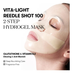 Máscara de hidrogel VT COSMETICS Vita-Light Reedle Shot 100 de 2 etapas, 4 peças – Pele luminosa e uniforme: experimente uma tez mais uniforme com uma máscara de hidrogel infundida com a essência de uma ampola inteira. – Complexo radiante poderoso: uma mistura potente de vitamina C, glutationa e melazero, um ingrediente que inibe a migração e a produção de células de melanina, ajuda a obter uma tez mais radiante. – Personalizável Cuidado calmante: escolha entre três opções calmantes com base no tempo de aplicação: Refrigeração e cuidado calmante rápido (30 a 40 minutos), cuidado calmante intensivo (2 horas) ou noturno Cuidado (uso prolongado). — Ajuste perfeito para uma absorção ideal: a máscara adere firmemente à pele, garantindo a máxima absorção da essência enquanto você dorme.