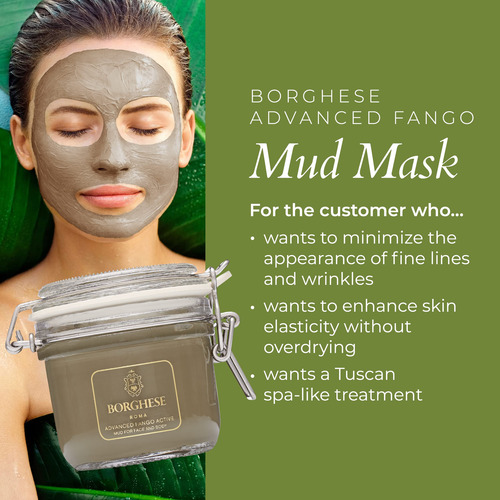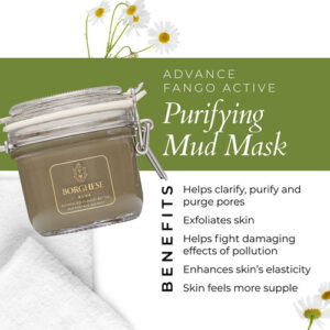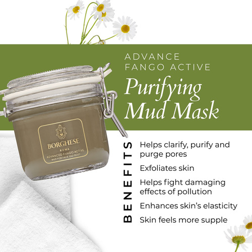 Borghese Advanced Fango Active Purifying Mud Mask, Detoxify & Clarify with Natural Minerals, For Face and Body, 7.5 Oz – Deep Pore Cleansing: Draws out dirt, oil, and impurities, minimizing pores for a clearer complexion – Skin Firming: Enhances skin elasticity with ingredients like Sweet Almond Oil and Avocado Oil – Environmental Defense: Fights the effects of pollution with Siberian Ginseng Root and Chaga Mushroom extracts – Hydrating & Nourishing: Bentonite clay and Hyaluronic Acid provide deep hydration while nourishing the skin – Gentle Exfoliation: Helps remove dead skin cells and smooths skin texture, promoting a radiant glow