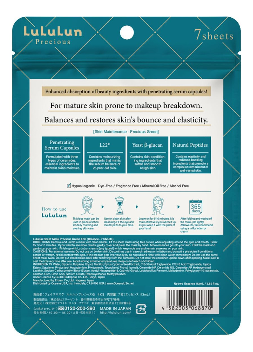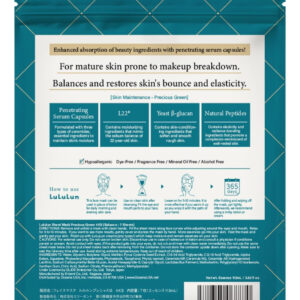 Equilibrar a pele propensa a flutuações devido ao envelhecimento e aos estressores ambientais. Precious GREEN é a melhor opção se você for… Ter uma pele flutuante Esperando obter uma pele saudável e macia Usando a série Lululun Precious pela primeira vez – L22, que recria o sebo de uma pele jovem. Nós nos concentramos no sebo, que apoia um ambiente de pele saudável. L22, um complexo de óleo derivado de plantas que recria o sebo de uma pessoa saudável de 22 anos, repõe e equilibra o sebo, que tende a se decompor com a idade e ajuda a prevenir o ressecamento e a rigidez. O L22 é um complexo de óleos vegetais que replica o sebo que tende a se decompor com a idade. – -glucano, um tipo de fermento que alivia a pele áspera O poder fermentado do -glucano, um polissacarídeo derivado do fermento de padeiro, é aplicado na pele. Ao regular suavemente a base da pele a partir de carboximetil-glucano sódico, ela suaviza e suaviza a pele de adultos com tendência à aspereza. A textura fina da pele e a clareza que salta a luz, que evitam o embotamento causado pelo ressecamento, são aprimoradas. – Acetil hexapeptídeo 8 de plantas naturais. Peptídeo natural focado no “sono bonito da pele”. Este é um peptídeo derivado de plantas que se concentra na relação entre falta de sono e pele áspera. – Advertências de inundação na pele do rosto Um pacote de máscara de lençol = 17,6 ml de essências aplicadas no rosto. O design da máscara de 3 camadas de espessura permite uma quantidade generosa de essências de beleza e oferece uma penetração profunda para hidratar a pele. O design do desenho oferece a conveniência de uso diário. – Danos diários; cuidados diários com a pele Sua pele recebe poeira UV e aérea 365 dias por ano; então você deve cuidar da pele todos os dias. Esta máscara facial diária suaviza a pele áspera, evita linhas finas e deixa a pele hidratada. Reduz a aparência de linhas finas e rugas causadas pelo ressecamento (eficácia testada).