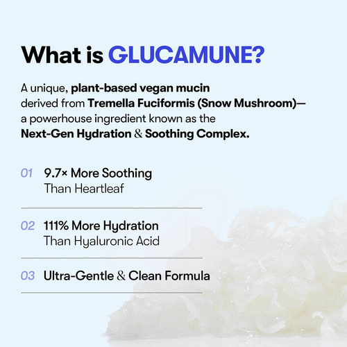 Hidratação vegana poderosa Formulada com glucamuna, uma mucina vegana à base de plantas derivada do cogumelo da neve (Tremella Fuciformis), fornecendo 111% a mais hidratação do que o ácido hialurônico para uma pele profundamente hidratada. – Acalma e acalma instantaneamente Reduz rapidamente a irritação e acalma a vermelhidão, proporcionando alívio rápido à pele sensível e estressada. – Ultra-suave e Fórmula segura Hipoalergênica, sem fragrância e formulada sem parabenos e substâncias químicas nocivas; ideal para peles reativas e facilmente irritadas.