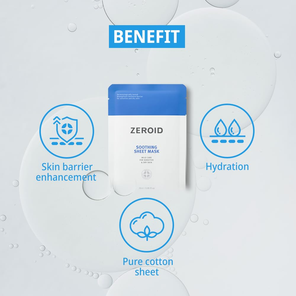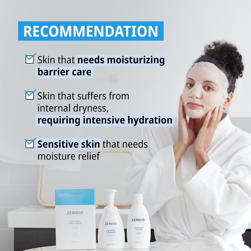 Uma máscara hidratante hipoalergênica para pele seca e sensível. Ingredientes principais -Ceramida-9S: Um ingrediente de ceramida desenvolvido exclusivamente que ajuda a melhorar a barreira cutânea enfraquecida -Ácido hialurônico 8 vezes (10.000 ppm): apresenta a capacidade de atrair e reter a umidade, mantendo a pele hidratada após a lavagem -Madecassoside: extraído da centella asiatica, eficaz na recuperação de danos à pele – Rejuvenesça sua pele: a máscara calmante ZEROID fornece hidratação intensa, atendendo especificamente à pele sensível e seca, deixando-a revigorada e revitalizada. Com o Ceramida-9s desenvolvido exclusivamente, torna saudável uma barreira cutânea enfraquecida. – Cuidado delicado: especialmente formulada para peles delicadas, nossa máscara suave acalma a irritação, reduzindo a vermelhidão e promovendo uma tez calma e equilibrada. – 28 ml de luxo: cada máscara de lençol é generosamente infundida com 28 ml de essência hidratante, garantindo um tratamento profundo e nutritivo para a saúde e hidratação ideais da pele. Feito com um lençol de algodão 100% puro que se ajusta suavemente à pele para garantir o uso seguro em peles sensíveis. – Aprovado por dermatologistas: o ZEROID tem a confiança dos dermatologistas, e nossas máscaras de lençol são projetadas para mimar sua pele com uma fórmula hipoalergênica, livre de produtos químicos agressivos. – Pacote conveniente com 5: desfrute de uma experiência de spa em casa com nosso valioso conjunto de máscaras de 5 folhas, perfeito para um ritual semanal de autocuidado para manter sua pele brilho natural.