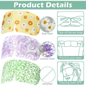 – Material confiável: essas máscaras de vapor descartáveis são feitas de tecido não tecido de qualidade, macias, respiráveis e seguras de usar; elas são projetadas com tiras elásticas para um ajuste confortável; a máscara de olhos a granel de 3 estilos permite que você escolha suas favoritas e mantenha seus olhos relaxados livremente