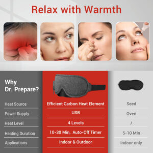 Our heated eye mask will help you get some rest, whether you are in the office or on a flight. The moist heat eye mask comes with a larger size and streamlined design to ensure soothing heat transfers to more areas. In addition, the enlarged nose gap and elastic band to block light well for various face shapes. Ultra-Soft Materials Snug yet non-restrictive, the cotton heating pad conforms to universal facial structures with softness and coziness. Adjustable Strap with Plastic Buckle Ensures the strap to fit most head sizes and prevents the hot eye compress from slipping off and getting tangled in hairs. Unstructured Nose Gap The enlarged flat nose design makes the warm eye mask create a universal fit for various faces, blocking out disturbing light for a sound sleep. Superior Moist Heat Spray water on the velvet reverse using the included bottle to enhance moist heat, helping to alleviate eye strains and fatigue. Simple steps to get started Step 1. Plug your heated eye mask to a 5V / 1A or 2A USB port to power up the eye mask. Step 2. Press F button to choose desired temperature. Step 3. Press Min button to set the desired length of time to heat. Step 4. If you set it correctly, the indicators of controller stay lit. Step 5. Unplug the power cord to turn off your heated eye mask. Notes: 1. Instantly stop using the eye mask if the temperature is abnormally high. 2. People with heat-sensitive skins should consult your doctor prior to the first use. 3. A 5-minute cold compress is advised after getting warm compress from this eye mask to achieve better effects. 4. DO NOT FOLD THE MASK IN HALF as this can damage the heating coil inside. A pouch is included for easy storage. Package: 1x Heated Eye Mask 1x 5ft USB cable (USB adapter) 2x Earplug 1x Storage Pouch 1x Spray Bottle – Optimal Heating ZonesA cotton exterior, flat design, and expanded size ensure this heated eye mask rests right on your eyes to keep soothing heat last for relieving tiredness, dry eyes and tensions. – Temperature & Timer SettingFeaturing 4 heat levels from 95F with up to 122F and 4 timer settings for automatic shut-off from 10min to 30min, this hot eye compress allows you to customize your own eye SPA for sleep satisfaction. – Enlarged Adjustable StrapUpgraded with a larger size and velvet reverse, the elasticated band and the small plastic buckle on it help create a comfortable fit for various face shapes and secure the eye mask in place. Plus the enlarged nose gap, the usb eye mask can shut out unwanted light for a daytime nap. Using before sleeping, you would fall asleep better. – USB-PoweredCompatible with most 5V / 1-2A USB outlets for universal power supply, this warm eye compress can be powered by laptops, battery packs, and car chargers. Please note that USB adapter is not included in the package. – Effortless MaintenanceThanks to the integrated design, this cotton sleep mask can go through wash to clean up the undesired buildup after using for a period. We kindly advise you to wash your eye mask on a regular basis for personal hygiene. Take it with you for free. If you have any problem about the product, please feel free talk to us. Make sure it connected the power supply before using, otherwise it will not heat up.
