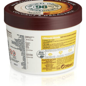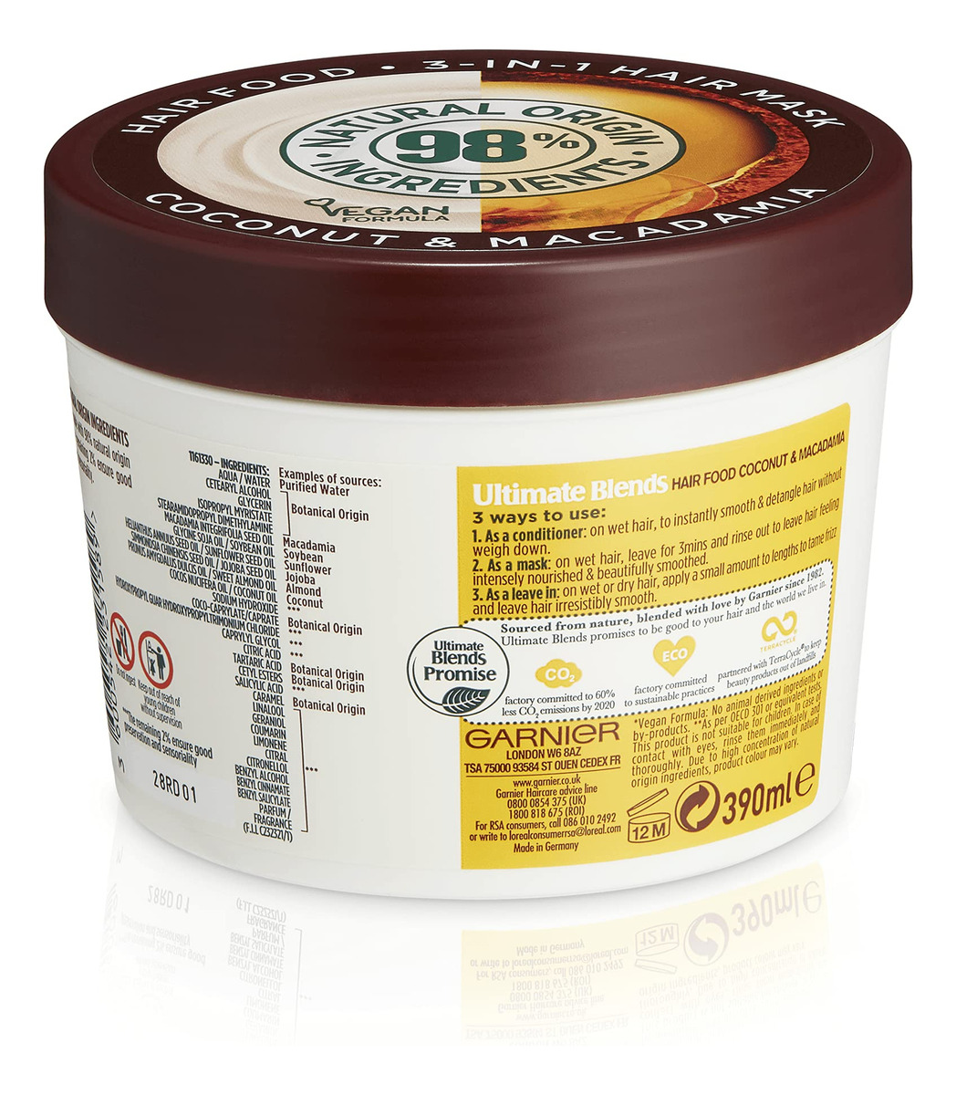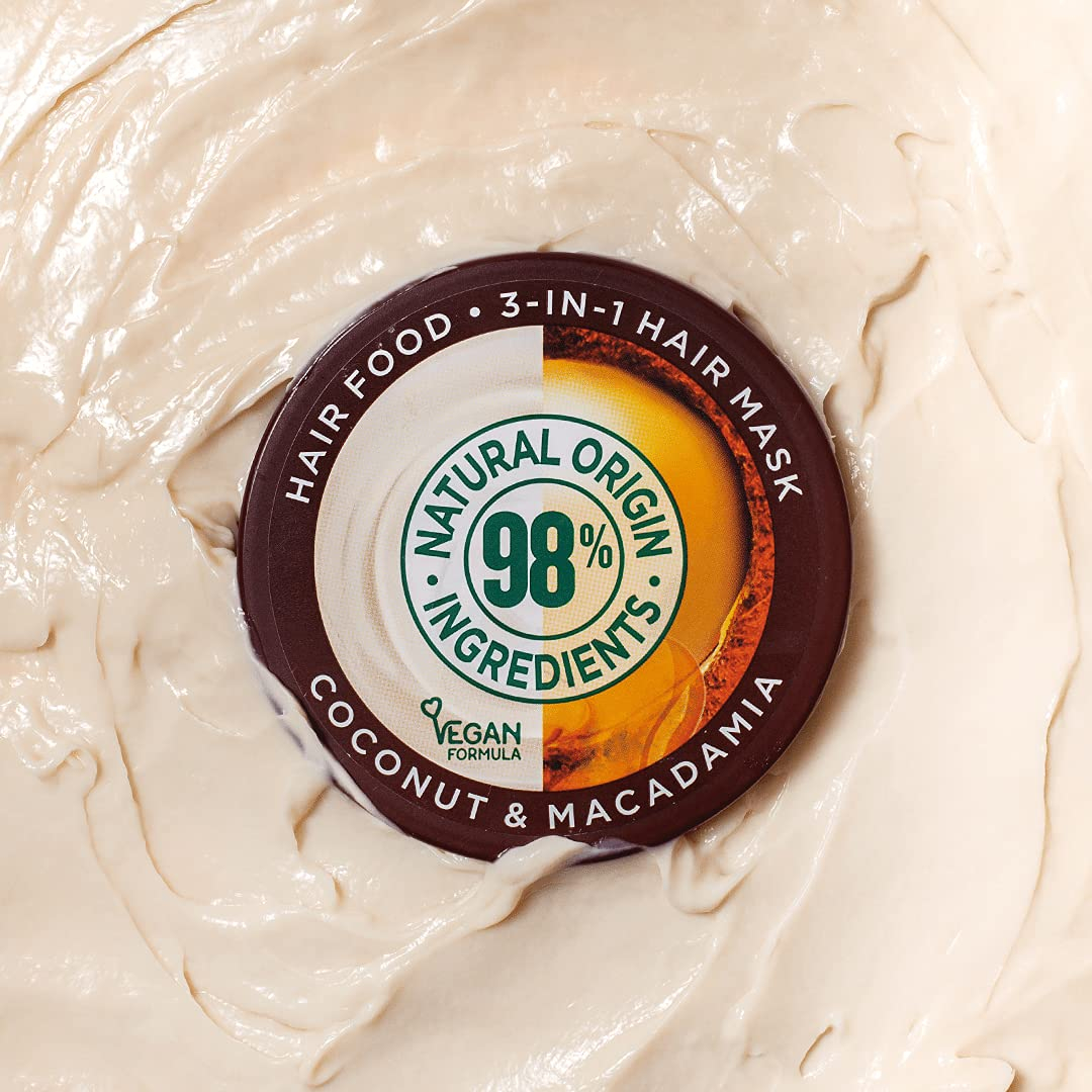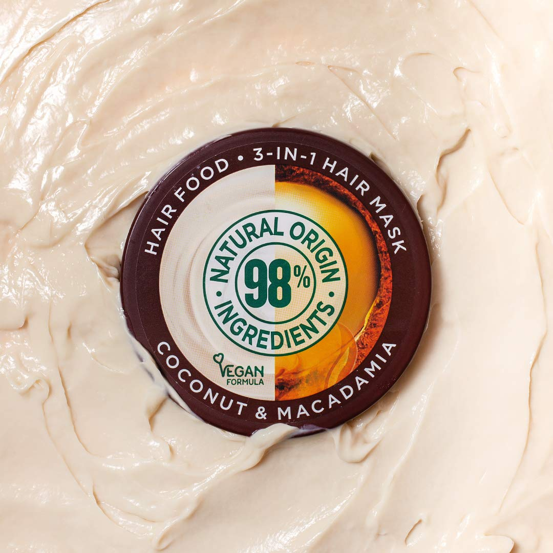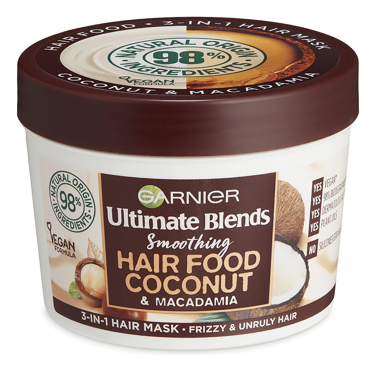 Máscara de tratamento capilar 3 em 1 Garnier Hair Food, suaviza e nutre, para cabelos crespos e encaracolados, sem silicones, fórmula vegana, óleo de coco, misturas definitivas, 400 ml — Tratamento multiuso para cabelos mais macios e macios, solução antifrizz, use como condicionador, máscara para enxágue ou condicionador sem enxágue, ideal para cabelos crespos e encaracolados — Deixa o cabelo macio e nutrido, deixa o cabelo mais liso por até 48 horas, fornece brilho intenso, recarga de umidade e aumento de força – Molhe o cabelo e aplique xampu, ensaboe e enxágue. Use condicionador nos comprimentos e pontas , Deixe por um minuto, enxágue, siga com a máscara como tratamento sem enxágue ou enxágue — Reforçado com vitaminas C, E, F, 98% de ingredientes de origem natural, fórmula 100% vegana, sem silicones para uma sensação natural, sem peso — Conteúdo: 1 x Garnier Ultimate Blends, máscara de tratamento capilar Hair Food Coco-Macadamia 3 em 1, para cabelos crespos e encaracolados, vegana Fórmula, volume: 400ml