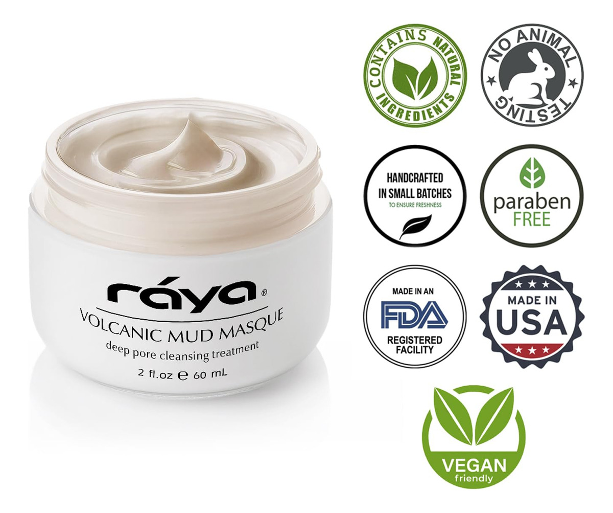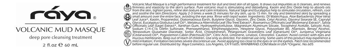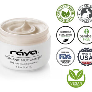 A máscara de lama vulcânica é um tratamento de alto desempenho para peles opacas e cansadas de todos os tipos. Ele retira as impurezas enquanto limpa e renova a firmeza e elasticidade da superfície da pele. A lama vulcânica pura é estimulante e desintoxicante e fornece um efeito antisséptico. O caulim e as argilas terrestres Fullers ajudam a absorver os óleos da pele, fechar os poros, refinar a textura da pele e acalmar irritações. Os óleos naturais de sálvia e eucalipto ajudam a estimular a circulação, além de refrescar, refrescar e acalmar a pele. O óxido de zinco ajuda a normalizar e proteger o pH da pele e o equilíbrio do óleo. A glicerina ajuda a proteger da perda de umidade. Aloe Vera e Alantoína oferecem propriedades calmantes e anti-inflamatórias. A máscara de lama vulcânica dissolve o excesso de óleo, dá uma sensação refrescante à pele, ajuda a remover o acúmulo de células mortas na superfície, impurezas e bloqueio de poros, promove atividade antibacteriana e tem um efeito aromaterapêutico refrescante, suave e natural de sálvia e eucalipto. Máscara de lama vulcânica (605) | RAYA – Máscara de tratamento de alto desempenho – Excelente para todos os tipos de pele opaca e cansada – Ajuda a absorver a oleosidade da pele, fechar os poros, refinar a textura da pele e acalmar irritações – Feita lama vulcânica pura estimulante e desintoxicante – Livre de parabenos, livre de crueldade, fabricada nos EUA, contém ingredientes naturais