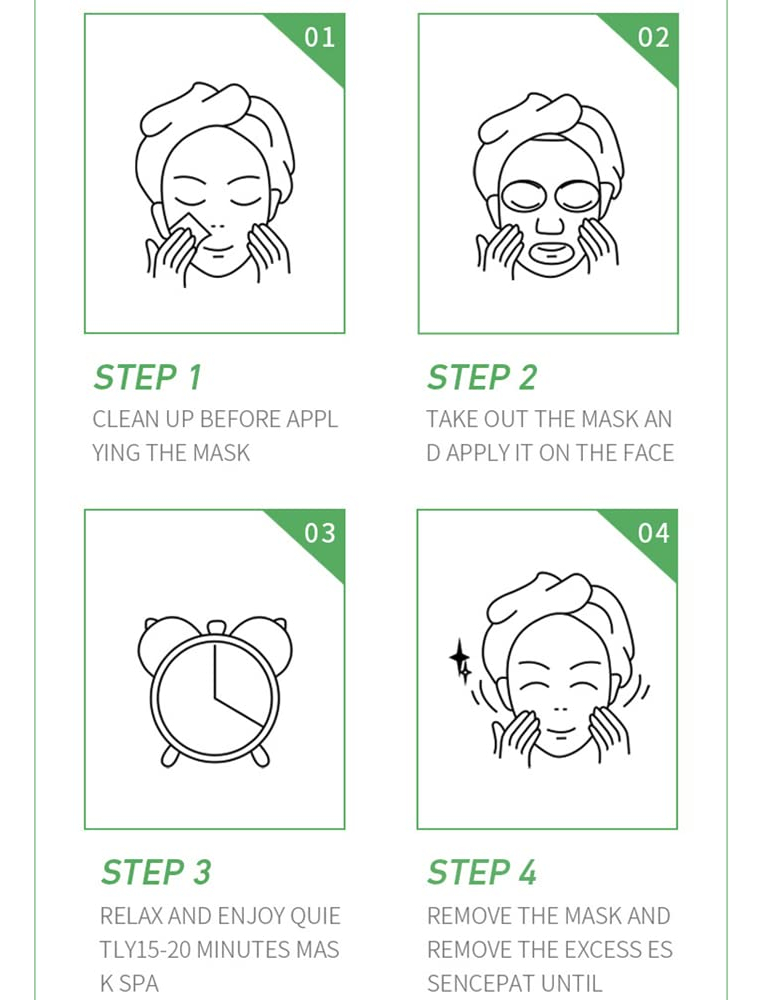 A MEMBRANA É FINA E MACIA. ELE SE AJUSTA BEM AO ROSTO, COMO UMA GAZE LEVE, CONTÉM A ESSÊNCIA DOS CUIDADOS COM A PELE, COMO A ALOE VERA. HIDRATA A PELE, HIDRATA E SUAVIZA, AJUDA A MELHORAR O ESTADO HÍDRICO E OLEOSO DA PELE E TORNA A PELE SUAVE E ELÁSTICA. INGREDIENTE: ÁGUA, EXTRATO DE FOLHA DE ALOE BARBADENSIS, PROPILENOGLICOL, GLICERINA, EDTA DISSÓDICO, HIDROXIETILCELULOSE, ALANTOÍNA, ÓLEO DE RÍCINO HIDROGENADO PEG – 40 OUTROS OLIGOCOMPONENTES: DIAZOLIDINIL UREIA, FRAGRÂNCIA, METILISOTIAZOLINONA, MÉTODO DE USO DE IODOPROPINIL BUTILCARBAMATO 1. Limpe a pele facial; 2. Abra a embalagem, desdobre a máscara e aplique a máscara no rosto; 3. Use os dedos para pressionar a máscara plana para que ela adira completamente ao rosto; 4. Relaxe, desfrute de 15 a 20 minutos, deixe a pele absorver totalmente os nutrientes da máscara 5. Tire a máscara e massageie a essência nutritiva restante no rosto até que seja completamente absorvida. CONSELHOS DE CUIDADO E SEGURANÇA: 1. Antes de usar, é recomendável experimentá-lo na pele atrás da orelha. Se não se sentir bem, pare de usá-lo; 2. Não deve ser usado por crianças menores de três anos; 3. Mantenha-o em um local fresco, evite altas temperaturas e luz solar direta; 4. Mantenha-o fora do alcance de crianças. – A membrana é fina e macia. ELE SE AJUSTA BEM AO ROSTO, COMO UMA GAZE LEVE, CONTÉM A ESSÊNCIA DOS CUIDADOS COM A PELE, COMO A ALOE VERA. HIDRATA A PELE – HIDRATA E SUAVIZA, AJUDA A MELHORAR O ESTADO HÍDRICO E OLEOSO DA PELE E TORNA A PELE SUAVE E ELÁSTICA. – MÉTODO DE USO 1. Limpe a pele facial; 2. Abra a embalagem, desdobre a máscara e aplique a máscara no rosto; 3. Use os dedos para pressionar a máscara plana para que ela adira completamente ao rosto; 4. Relaxe, desfrute de 15 a 20 minutos, deixe a pele absorver totalmente os nutrientes da máscara 5. Tire a máscara e massageie a essência nutritiva restante no rosto até que seja completamente absorvida. – CONSELHOS DE CUIDADO E SEGURANÇA: 1. Antes de usar, é recomendável experimentá-la na pele atrás da orelha; se não se sentir bem, pare de usá-la; 2. Não deve ser usada por crianças menores de três anos; 3. Mantenha-a em local fresco, evite altas temperaturas e luz solar direta; 4. Mantenha-a fora do alcance de crianças.