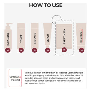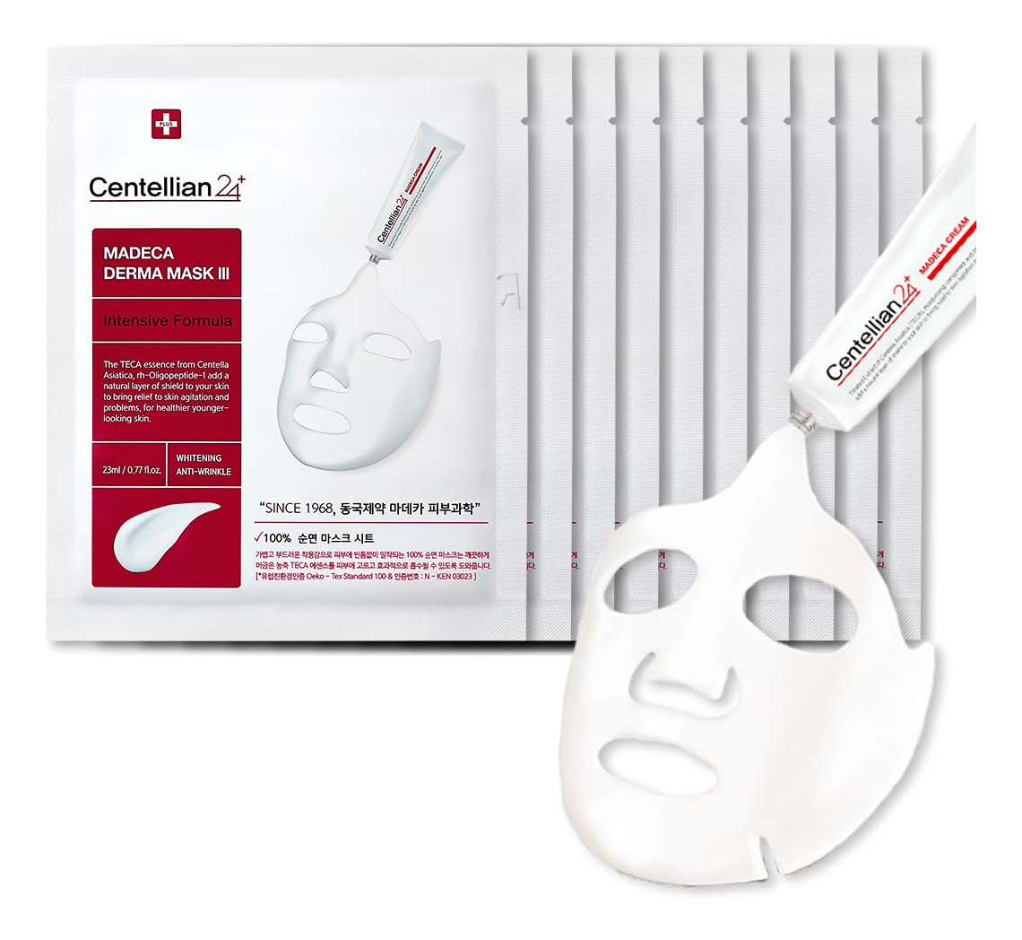 Máscara facial Centellian 24 Madeca Derma (intensiva, 10 unidades) — máscara calmante de algodão para todos os tipos de pele sensível, hidratação 24 horas. Cuidados com a pele coreanos premium. TECA, Centella Asiatica, Madecassoside. — MÁSCARA DERMA CENTELLIAN 24 MADECA, FÓRMULA INTENSIVA (10 unidades) — Nossa máscara Madeca Derma acalma e suaviza suavemente a pele sensibilizada. Ela revitaliza e oferece alívio, fornecendo hidratação 24 horas à pele, promovendo assim uma tez mais lisa. – NUTRA E HIDRATE – Infundida com TECA (extrato titulado de centella asiatica) e EGF (fator de crescimento epidérmico), nossa fórmula intensiva funciona em harmonia com o ciclo natural de reparo noturno da pele. Aplique como parte de sua rotina de cuidados com a pele à noite para acordar com uma pele profundamente hidratada e nutrida. A essência rica e leitosa, repleta de nutrientes, garante que sua pele receba tudo o que precisa para parecer revigorada pela manhã. – FÓRMULA RICA E NUTRITIVA – Mergulhe sua pele em uma hidratação luxuosa com a fórmula rica e nutritiva de nossa emulsão. Formulado com TECA e outros ingredientes ativos, ele é absorvido rápida e profundamente pela pele sem deixar nenhum resíduo oleoso. Experimente uma pele macia e completamente cuidada com nossa formulação de essência leitosa, fornecendo hidratação intensa e nutrientes vitais para uma aparência visivelmente rejuvenescida. – Lençóis 100% algodão – Sinta-se bem com o que você está colocando na pele. Nossas máscaras são feitas de algodão 100% puro, proporcionando uma experiência suave e luxuosa de cuidados com a pele. O algodão macio e macio adere firmemente, permitindo a máxima absorção da essência sem bagunça, tornando sua rotina de cuidados com a pele eficaz e conveniente. – CENTELLIAN 24 – Como principal marca de dermocosméticos da Dongkook Pharmaceutical, a Centellian 24 integra perfeitamente mais de cinco décadas de experiência pioneira em centella asiatica. Aproveitando o poder dessa maravilha botânica, os produtos Centellian 24 são meticulosamente criados para rejuvenescer e nutrir sua pele, garantindo proteção e vitalidade 24 horas por dia.