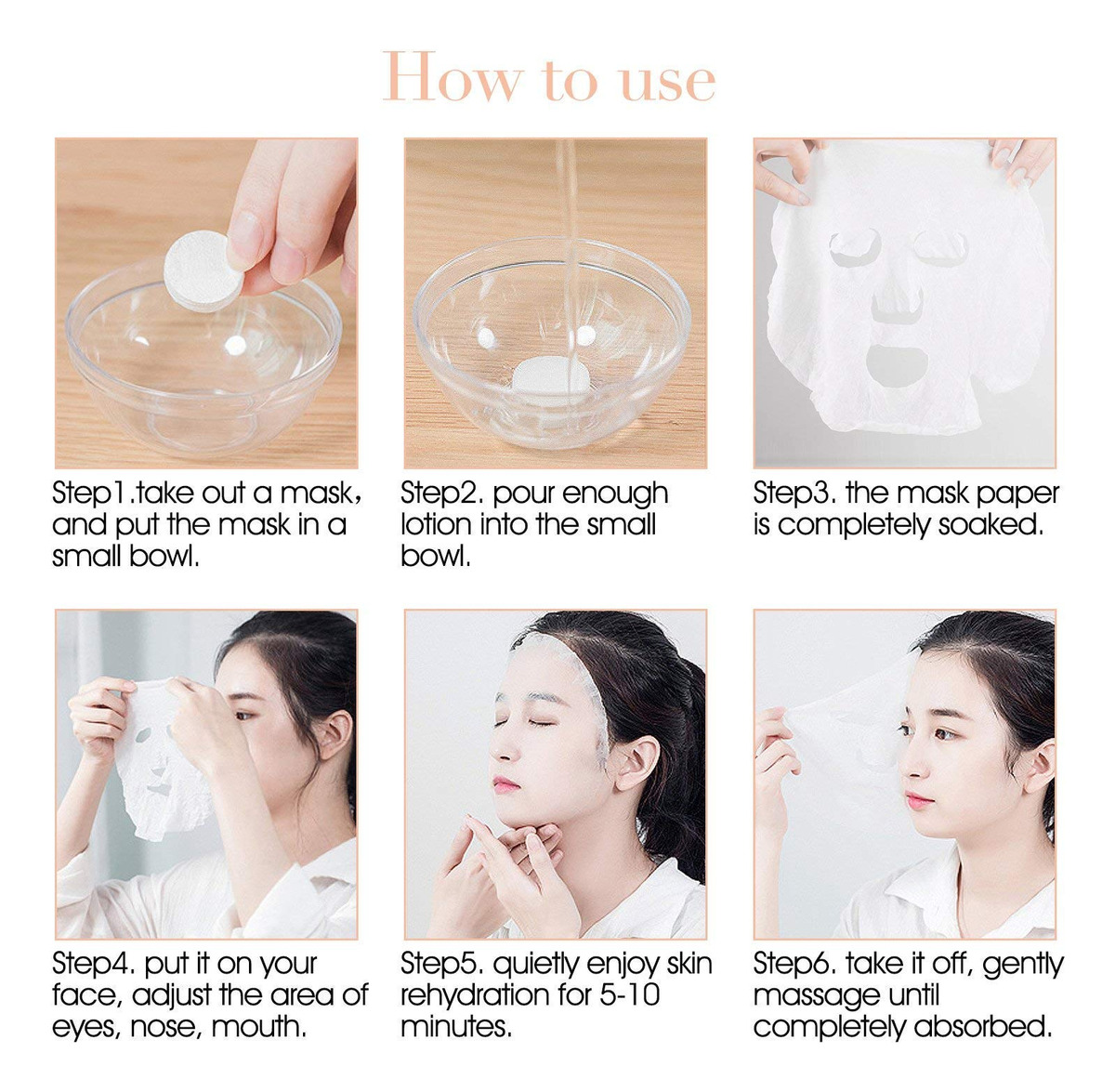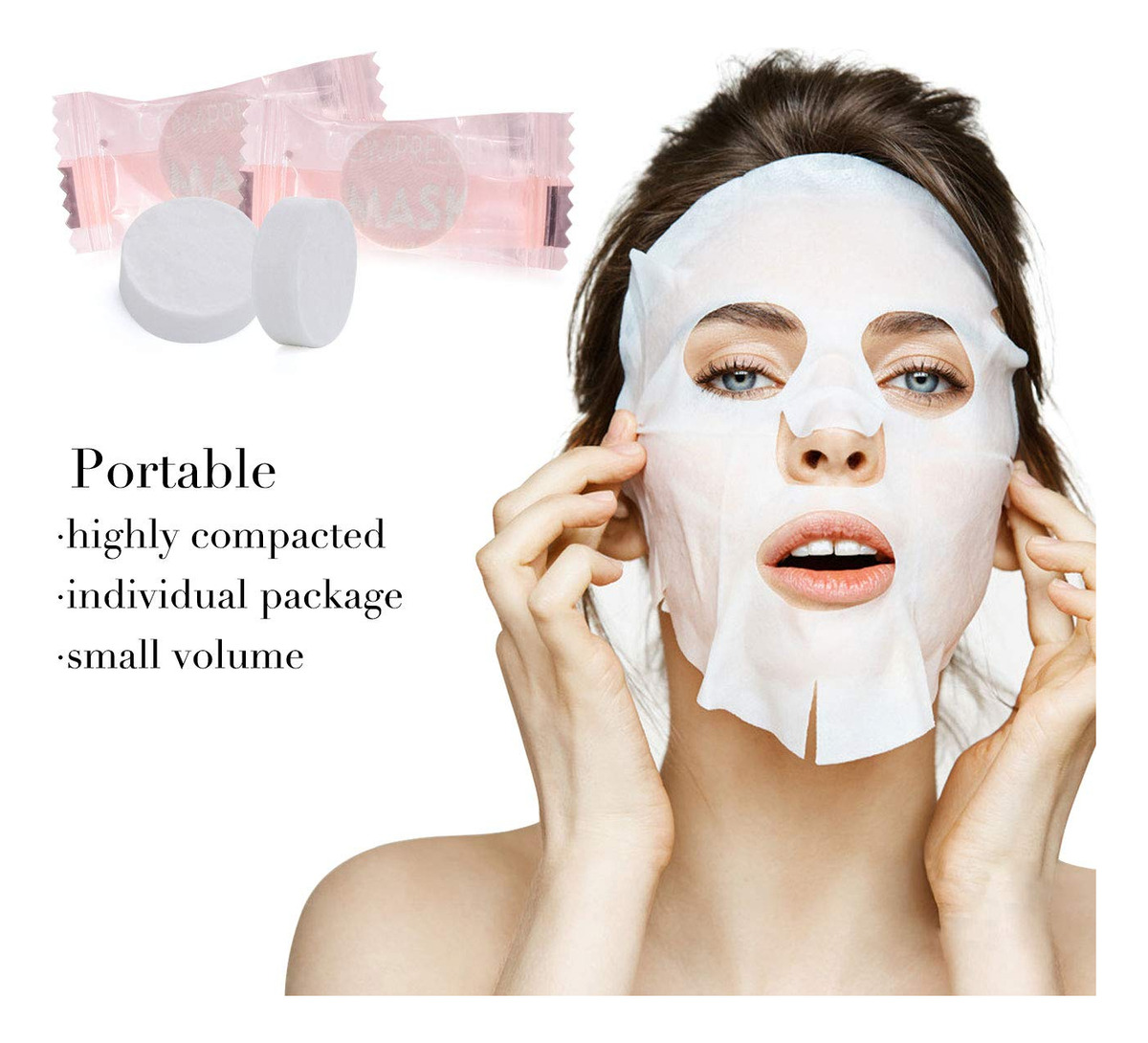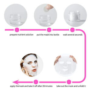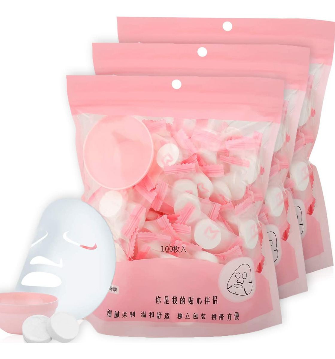 Existem 300 peças de máscaras faciais comprimidas. Três pacotes, cada pacote tem uma pequena tigela de máscara. A máscara comprimida a seco é feita de algodão natural não tecido, não contém nenhuma composição química, nenhuma fragrância química, o que é uma hidratação saudável e confortável. O tipo saco de doces pode ajudar você a economizar muito espaço e é fácil de transportar, ótimo para viagens. COMO USAR: Aviso: Esta é uma máscara comprimida a seco. Se não tiver a loção, siga as etapas abaixo para fazer você mesmo sua máscara. 1. Retire uma máscara e coloque-a em uma tigela pequena. 2. Despeje bastante loção na tigela pequena. 3. O papel da máscara está completamente encharcado. 4. Coloque no rosto, ajuste a área dos olhos, nariz e boca 5. Desfrute silenciosamente da reidratação da pele por 5 a 10 minutos 6. Retire-o e massageie suavemente até que seja completamente absorvido – 3 sacos/300 unidades no total. A máscara é papel de máscara facial comprimido a seco. Não há produto facial embutido no papel. – Você precisa adicionar mais produtos faciais (como líquido de beleza, leite, xarope) ao recipiente da máscara ao usar. – Absorvente e forte, descartável, para cuidar da pele facial sozinho ou em um salão de beleza. – Confortável e saudável, feita de algodão natural não tecido – não contém composição química. sem adição química, sem fragrância química, ótima para mais tipos de cuidados com a pele. – Embalagem individual, economiza muito espaço e é fácil de levar, ótima para viagens.