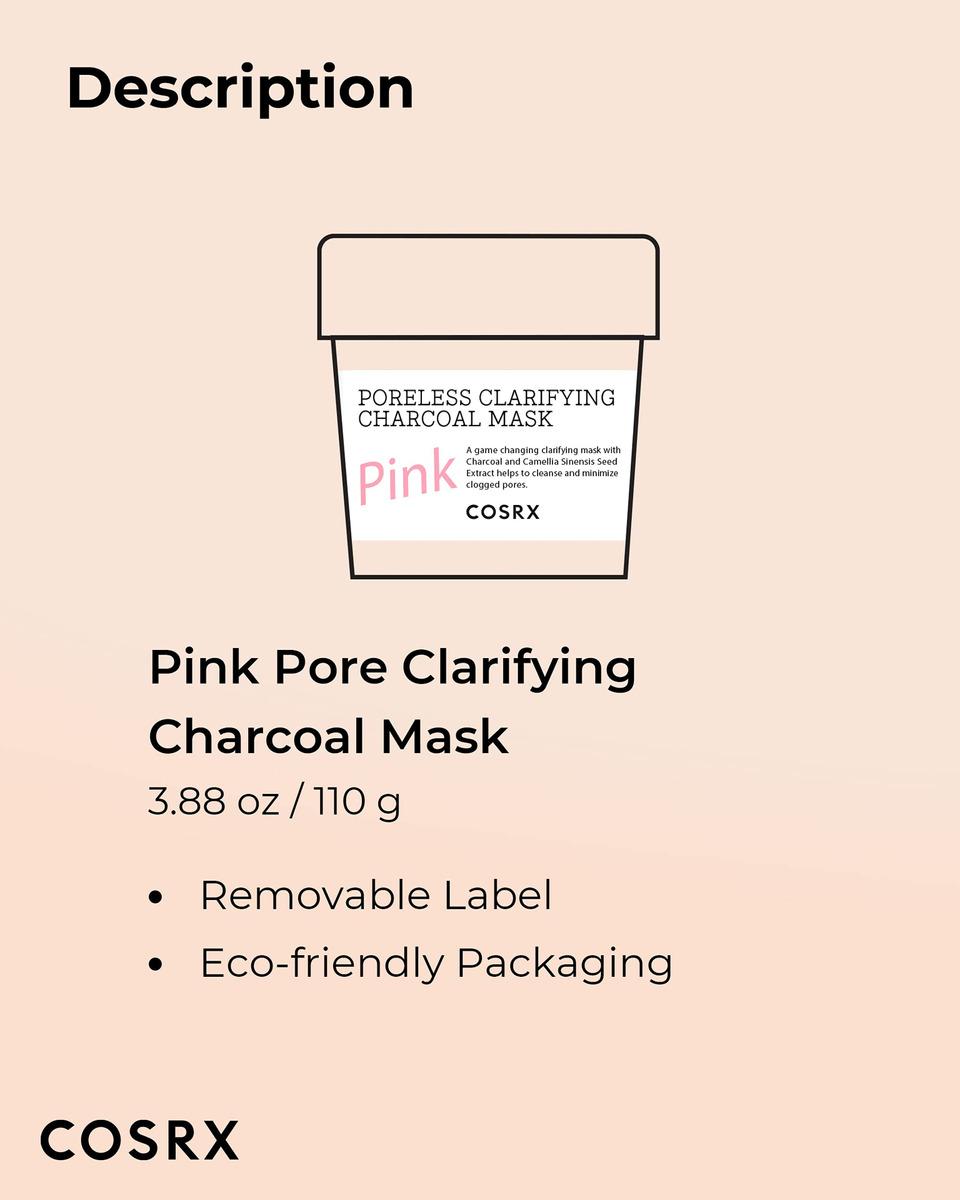 Máscara de carvão clareador de poros rosa — Máscara de argila de carvão rosa: máscara rosa purificadora e que aperfeiçoa a pele para transformar sua noite de autocuidado em um spa profissional! – Use rosa, tenha uma aparência impecável, sinta-se fofa: a máscara facial indispensável em sua penteadeira para ficar fofa e se sentir fofa. – Ingredientes principais: pó de carvão vegetal, calamina, extrato de semente de chá verde e ácido salicílico. – Terapia de pele que muda de cor: veja a cor mudar de rosa para cinza e depois para branco enquanto faz maravilhas com sua pele. – Padrões COSRX: todos os produtos COSRX são formulados com produtos que não agridem a pele ingredientes que aliviam a pele irritada. Hipoalergênico, testado dermatologicamente, sem testes em animais, sem parabenos, sem sulfatos, sem ftalatos