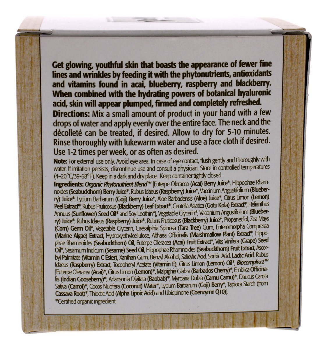 Esta máscara é uma combinação única de açaí, mirtilo, framboesa e amora que alimenta sua pele e a mantém com aparência saudável. Ele tonifica e regenera sua pele para uma aparência sem idade.