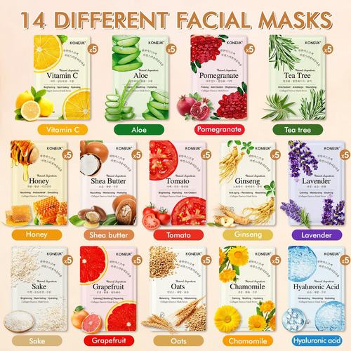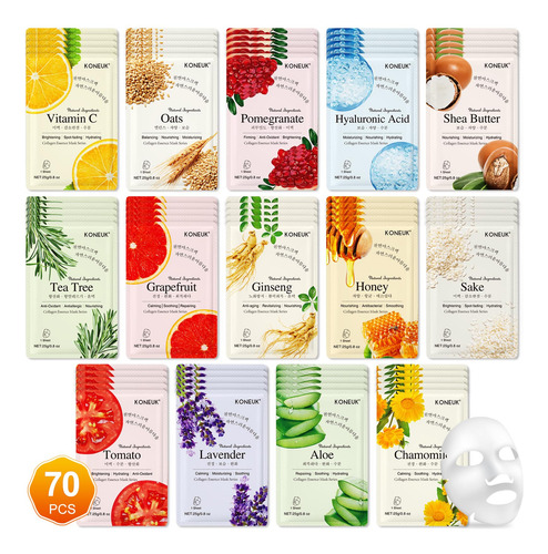 Conjunto de 70 máscaras faciais para presente Nosso lençol facial mascara os cuidados com a pele com 14 ingredientes naturais, como aloe, romã, mel, manteiga de karité, tomate, ginseng, lavanda, saquê, aveia, toranja, camomila, ácido hialurônico, vitamina C, melaleuca. A essência rica de colágeno pode ser rapidamente absorvida pela pele, a pele ficará mais lisa e jovem. Se você estiver seca e oleosa Para peles sensíveis, cada máscara facial se concentra em diferentes problemas de pele. Os cuidados com a pele com máscaras faciais em massa ajudam a hidratar e aliviar a pele seca e a reduzir linhas finas e rugas. A pele equilibrada, se usada todos os dias, hidrata a pele e mais apertado. Presentes perfeitos para vários festivais Como usar máscaras faciais para cuidados com a pele 1. Retire a máscara facial, remova a película de cobertura de um lado, 2. Limpe o rosto e cubra o rosto, 3. Relaxe e deixe na pele por 15 a 20 minutos, 4. Remova a máscara, massageie suavemente o rosto e lave com água. – Pacote com 70 máscaras faciais Nosso lençol facial mascara os cuidados com a pele com 14 ingredientes naturais, como aloe, romã, mel, tomate e ginsena g, lavanda, saquê, aveia, toranja, camomila, ácido hialurônico, vitamina C, tea tree, manteiga de karité. A essência rica de colágeno pode ser rapidamente absorvida pela pele, a pele sentirá Mais suave e jovem — Presentes perfeitos para vários festivais À medida que o festival se aproxima, quando você ainda está hesitando sobre qual presente dar ao seu amante, experimente nosso conjunto de máscaras faciais. São presentes perfeitos de Dia dos Namorados, presentes de Dia das Mães, presentes de Natal, presentes de agradecimento a professores, presentes de semana de enfermagem e presentes de aniversário. – Cuidados com a pele para todos os tipos de pele. Se você tem pele seca, oleosa ou sensível, cada máscara facial se concentra em diferentes problemas de pele, volume máscaras faciais e cuidados com a pele ajudam a hidratar e aliviar a pele seca e reduzir linhas finas e rugas e equilibrar a pele, se usadas todos os dias, deixe a pele hidratada e mais firme. – Conjunto de presentes de relaxamento para mulheres A máscara facial é lindamente embalada, com várias cores e fragrâncias. São ótimos presentes de spa para mulheres, esposa, mães, avós e namorada. Enchimentos perfeitos para mulheres. Essas máscaras faciais premium podem ajudar a aliviar o estresse e cuidar da pele ao mesmo tempo. – Como usar máscaras faciais para cuidados com a pele 1. Retire a máscara facial e remova a cobertura filme de um lado, 2. Limpe o rosto e cubra o rosto, 3. Relaxe e deixe na pele por 15-20 minutos, 4. Remova a máscara, massageie suavemente o rosto e lave com água.