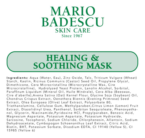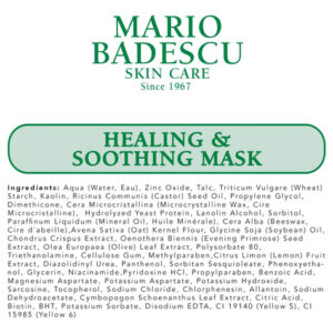 Máscara curativa e calmante Mario Badescu — Máscara facial cremosa e reconfortante com argila de caulim, niacinamida e óxido de zinco — Restaura o equilíbrio e alivia o ressecamento — Ideal para pele oleosa ou problemática — Não endurece e é eficaz para peles muito sensíveis ou secas com acne — Contém bálsamo calmante peruano, um ingrediente natural e calmante. — Acalma a vermelhidão e a irritação. Acelera a cicatrização da pele com erupções de acne.