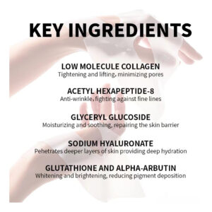 Por favor, escolha MUQIAN BEAUTY de verdade! O segredo para ter uma pele mais jovem está na máscara lifting anti-rugas de colágeno profundo. Esta máscara foi projetada para proporcionar uma pele firme, hidratada e macia. Sua fórmula exclusiva nutre profundamente a pele, reduz as rugas e melhora a elasticidade, deixando você com uma pele jovem e revitalizada. – Escolha MUQIAN BEAUTY DE VERDADE! Nutrição com colágeno: O colágeno é um dos principais componentes da pele e, à medida que envelhecemos, a pele perde colágeno, causando rugas e flacidez. A máscara anti-rugas profunda de colágeno é enriquecida com uma alta concentração de colágeno, que pode repor com eficácia o colágeno necessário à pele, restaurando a elasticidade e o brilho da pele. – Nutrição e reparo profundos: usando tecnologia de penetração exclusiva, a máscara facial de colágeno penetra profundamente nas camadas subjacentes da pele, penetrando rapidamente para fornecer nutrição e reparo duradouros à pele. Não só pode reparar os danos à pele, mas também melhorar o tom irregular da pele, a aspereza e outros problemas, para que a pele brilhe com saúde. – Efeito lifting anti-rugas: a máscara ativa na máscara facial noturna de colágeno pode estimular a produção de colágeno e promover o metabolismo da pele, reduzindo assim a aparência de linhas finas e rugas. Ao mesmo tempo, a máscara de colágeno também pode levantar a pele e apertar os contornos faciais, deixando sua pele mais jovem e firme. – Calmante e hidratante: a máscara de colágeno é rica em hidratantes, que podem formar uma película protetora, bloqueando a umidade da pele e mantendo-a hidratada e macia por muito tempo. Ao mesmo tempo, a máscara de colágeno também tem um efeito calmante e calmante, pode aliviar o ressecamento, a rigidez e outros desconfortos da pele, para que sua pele brilhe com uma sensação confortável. – Cuidado: Não entre em contato com os olhos. Em caso de contato inadvertido, enxágue imediatamente com água. O teste de sensibilidade é recomendado. Se ocorrer desconforto, interrompa o uso imediatamente.