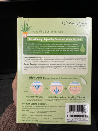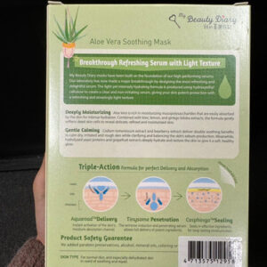 Máscara facial calmante My Beauty Diary Aloe Vera (8 folhas) – Nova versão em inglês – Mantenha sua pele hidratada: Aloe Vera é uma variedade de Aloe que tem uma adaptabilidade particularmente forte ao ambiente. Encontrada naturalmente em climas extremamente áridos, a planta aloe desenvolveu uma série de mecanismos para se proteger contra danos ambientais e perda de água. A polpa espessa de aloe é rica em mucopolissacarídeos que são eficazes em fornecer e reter umidade intensa na pele, acalmando a pele irritada, resultando em uma pele firme e hidratada. – Obtenha uma aparência natural: o extrato de Códio tomentosum e o extrato de uva-ursina oferecem benefícios calmantes duplos para acalmar a pele seca, irritada e áspera, ao mesmo tempo que clarificam e equilibram a produção de sebo da pele. Enquanto isso, proteínas hidrolisadas de levedura e extratos de toranja hidratam profundamente e restauram a pele, proporcionando um brilho macio e saudável. – Ingredientes seguros e não irritantes: extratos vegetais naturais aumentam a vitalidade e a firmeza da pele. Sem adição de parabenos, conservantes, álcool, óleos minerais, corantes ou substâncias fluorescentes migráveis. – Ótima para qualquer ocasião: inclua esta máscara fácil de aplicar em sua rotina diária, use socialmente com amigos ou dê de presente. Experimente na geladeira para uma sensação extra refrescante e refrescante! Igualmente eficaz para adolescentes, mulheres e homens. Ideal para pele normal e oleosa. – Junte-se à tendência: experimente a receita premiada da principal marca de máscaras faciais descartáveis de Taiwan e veja por que consumidores de todo o mundo estão se juntando à comunidade My Beauty Diary.