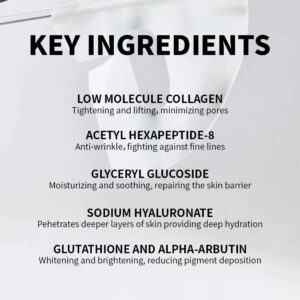 Experimente o melhor luxo de cuidados com a pele durante a noite com nossa máscara noturna de colágeno profundo. Formulada para nutrir e rejuvenescer profundamente a pele enquanto você dorme, esta máscara de colágeno é sua arma secreta para acordar com uma tez radiante. Enriquecido com uma potente essência de colágeno, ele efetivamente diminui linhas finas e rugas, restaurando elasticidade e firmeza. A fórmula leve e não oleosa é rapidamente absorvida, proporcionando hidratação intensa e deixando sua pele macia e sedosa. Perfeita para todos os tipos de pele, nossa máscara anti-rugas de colágeno profundo promete resultados visíveis com o mínimo esforço. Eleve sua rotina noturna e descubra o poder transformador de uma pele jovem e brilhante, todas as manhãs. – Hidratação profunda: infundidas com uma potente essência de colágeno, nossas máscaras de colágeno penetram profundamente nas camadas da pele, reabastecendo a umidade e restaurando a elasticidade. A máscara de colagem profunda retém a hidratação, deixando sua pele macia, flexível e radiante. – Absorção aprimorada: o design exclusivo das máscaras faciais de colágeno garante a máxima absorção de nutrientes, deixando sua pele refrescada e revitalizada. Leve e não oleosa, nossa máscara noturna de colágeno é rapidamente absorvida sem obstruir os poros, perfeita para todos os tipos de pele. – Reparo noturno: infundida com essência concentrada de colágeno, a máscara facial de colágeno funciona durante a noite para hidratar e reparar profundamente a pele enquanto você dorme. – Firmante e endurecedora: acorde com uma pele mais firme e elástica. Nossa fórmula rica em colágeno ajuda a reduzir a aparência de linhas finas e rugas, dando à sua pele uma sensação de juventude. – Facilidade de uso: cada máscara de colágeno é embalada individualmente para maior comodidade. Basta tomá-lo antes de dormir e deixar a máscara fazer sua mágica durante a noite. Acorde com uma pele visivelmente mais lisa e rejuvenescida.