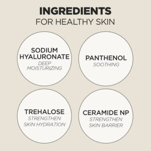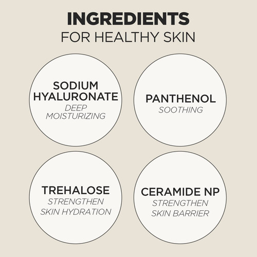 – Ingredientes que adoram a pele: enriquecidos com ácido hialurônico, Pantenol, trealose e ceramida para hidratar instantaneamente, equilibrar o pH e melhorar a textura da pele. Essa terapia profundamente hidratante e revitalizante ajuda a criar uma pele mais firme, saudável e equilibrada. Confere à pele um efeito calmante e adstringente para manter uma condição saudável, ao mesmo tempo que a mantém hidratada, rejuvenescida e radiante.