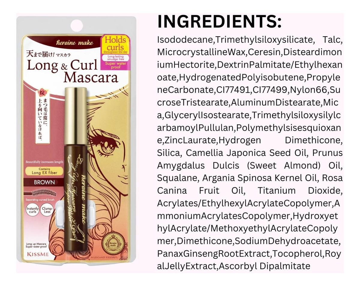 Linda densidade de cílios UP! Novo rímel superimpermeável com impermeabilidade supervolumizante e ainda mais forte. COMO USAR: 1. Com a curva interna do pincel de rímel, penteie o rímel da raiz às pontas. 2. Vire o pincel de rímel e, usando a curva externa, penteie os cílios novamente e cubra os cílios finos. PARA REMOVER: É altamente recomendável usar o removedor de rímel Heroine Make Speedy para remover o rímel. Ou use um removedor de maquiagem à base de óleo para remover e enxágue bem. INGREDIENTES: Isododecano, trimetilsiloxissilicato, talco, waresina microcristalina, hectonte de disteardimônio, palmitato de dextrina/etilhexanoato, poliisobuteno hidrogenado, carbonato de propileno, Cl 77491, CI 77499, nylon-66, triestearato de sacarose, diestearato de alumínio, mica, gliceril Isoestearato, trimetiissiloxissildcarbamoil pululano, polivmetilsilsesquioxano, laurato de zinco, dimeticona de hidrogênio, sílica, óleo de semente de camélia japonica, óleo de Prunus Amygdalus dulcis (amêndoa doce), esqualano, óleo de semente de Argania Spinosa, óleo de fruta Rosa Canina, titânio Dióxido, acrilatos/etilhexilo Copolímero de acrilato, copolímero de acilatos de amônio. Copolímero de acrilato de hidroxietia/metoxietil acrilato, dimeticona, desidroacetato de sódio, extrato de raiz de panax ginseng, tocoferol, extrato de geleia real, dipalmitato de ascorbila — Efeito de alongamento SUPER DINÂMICO O rímel de maquiagem contém 5 mm de fibra longa para alongar, dar volume e manter a ondulação. – Segure os cachos o dia todo com Ingredientes fixadores e polímeros em forma de memória mantêm os cílios curvados para cima por um dia inteiro. – Ultra forte, à prova d'água. É extremamente resistente a lágrimas, suor, água, óleos e abrasões, evitando manchas durante todo o dia. – Materiais orgânicos para manter os cílios saudáveis Os elementos de maquiagem do rímel, incluindo (óleo de camélia, extrato de geleia real, óleo de argan, óleo de rosa selvagem, extrato de raiz de panax ginseng e óleo de amêndoa) protegem os cílios sensíveis contra danos ao usar maquiagem. – Fabricado no Japão. A marca de rímel à prova d'água número 1 no Japão, com a qualidade japonesa confiável para fornecer o melhor rímel e materiais orgânicos.