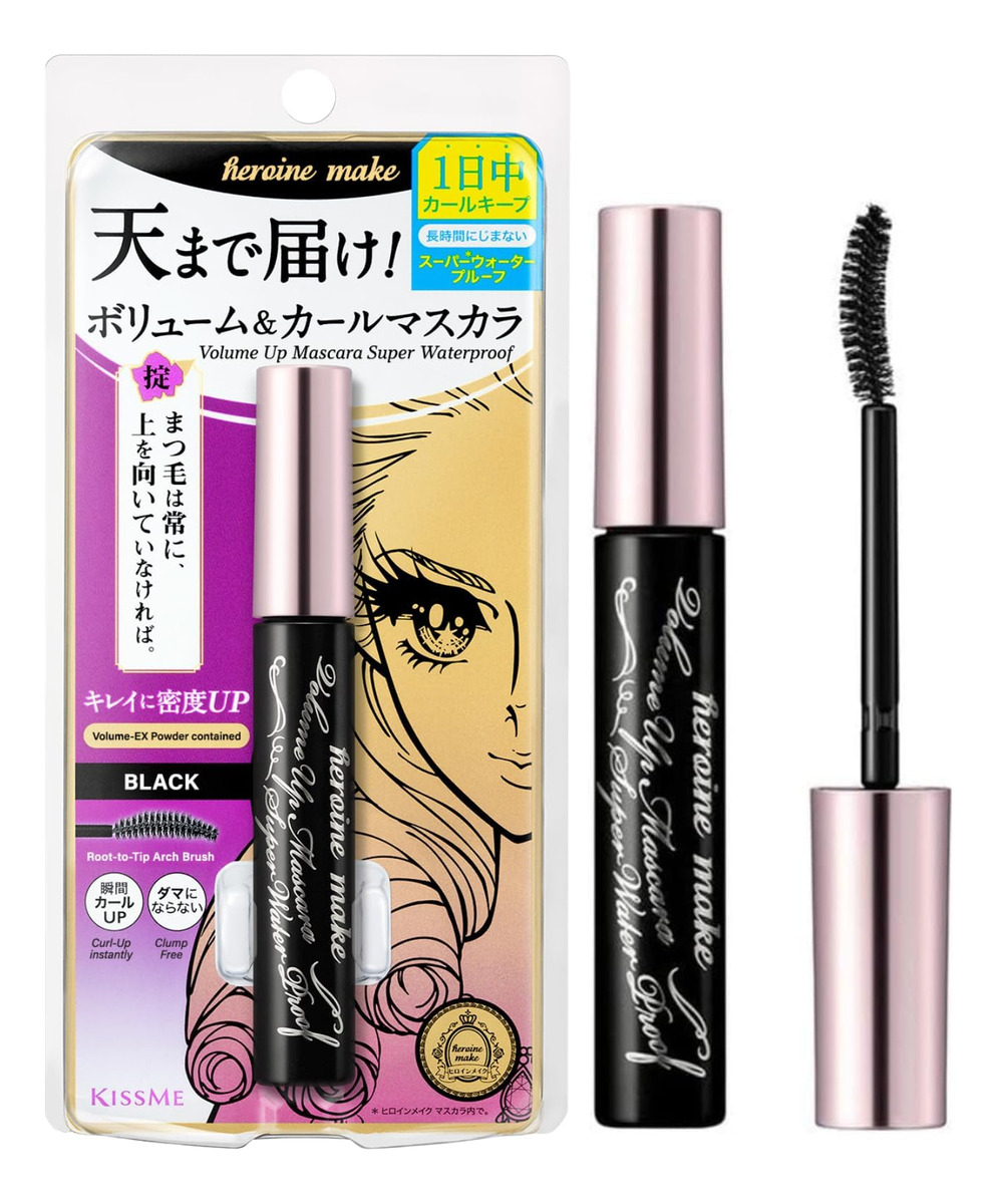 Máscara volumizante de maquiagem para olhos HEROINE MAKE by KISSME com pincel preto curvilíneo impermeável, definindo fibra e efeito de cílios postiços de longa duração, fabricada no Japão – Rímel volumizante contendo pó EX Powder: inclui pó separado por volume que aumenta a densidade dos cílios, definindo cada camada de revestimento, criando lindos cílios cheios para maquiagem de rímel. – 24 horas de retenção de cachos: com ingredientes que bloqueiam os cachos e o polímero em forma de memória, mantém os cílios cheios. – 24 horas de retenção de cachos e polímero em forma de memória levantado para cima por 24 horas. — Ultra forte à prova d'água: resistente a rasgos, suor, água, óleos e abrasões, evitando manchas durante todo o dia. – 6 ingredientes orgânicos do sérum para cílios: óleo de argan, óleo de camélia, extrato de geleia real, óleo de rosa selvagem, extrato de raiz de ginseng de panax e óleo de amêndoa. Os ingredientes do tratamento de cílios protegem os cílios sensíveis contra danos ao usar maquiagem nos olhos. — Fabricado no Japão: rímel à prova d'água número 1 em maquiagem para os olhos com qualidade confiável padrão japonesa. Os produtos são fabricados pelas fábricas bem administradas do Japão.