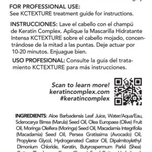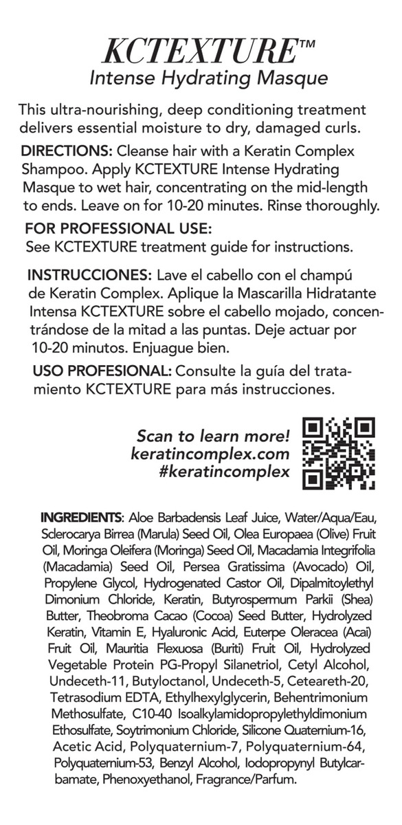 Máscara Hidratante Intensa Keratin Complex KCTEXTURE, 4 floz — Um tratamento condicionador profundo e ultra-nutritivo que fornece umidade essencial aos cachos secos e danificados. A etapa final do protocolo KCTEXTURE Curl Enhancing Keratin System e cuidados essenciais para o cliente.