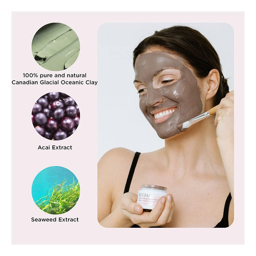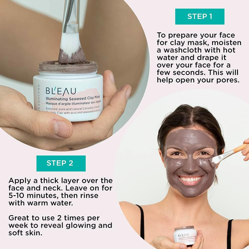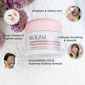 PRODUTO: Máscara iluminadora de argila de algas marinhas BLEAU – Máscara de argila iluminadora para todos os tipos de pele – Aumenta o colágeno, limpa profundamente e fecha os poros – Esclarece e equilibra – Origem natural – 80 g e Peso líquido. 2,8 onças