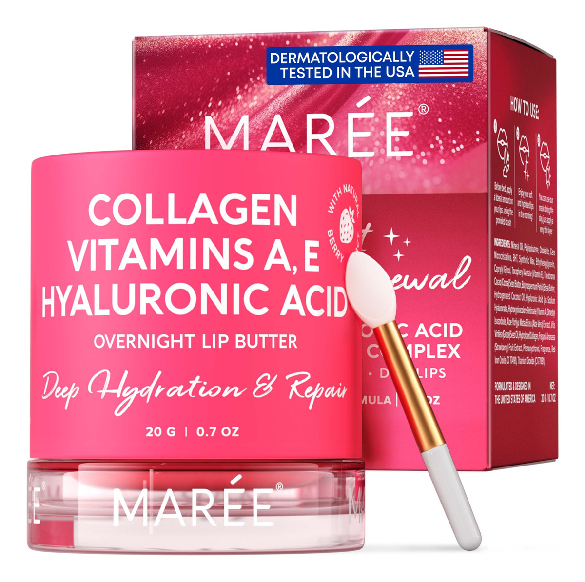 A marca Maree foi projetada para ser divertida, memorável e compartilhada. Acreditamos que o bom humor traz olhares alegres. Em designs inteligentes, você encontrará cuidados com a pele charmosos e de alta qualidade com nossos produtos de cuidado labial que amplificam e realçam sua beleza natural. A Maree tem o orgulho de apresentar uma máscara labial com sabor de morango fresco, hidratante labial com colágeno, vitaminas A e E, óleo de coco, manteiga de karité e ácido hialurônico para mulheres e homens. Esta manteiga labial SPF profissional, científica e sustentável pode: – Curar rachaduras e ressecamento – Hidratar e renovar sua pele – Fornecer hidratação e tratamento labial de longa duração – Reduzir o ressecamento e rachaduras – Hidratar e rejuvenescer profundamente seus lábios, tornando-os macios e suaves. Veja o hidratante labial premiado da Maree para lábios muito secos Ingredientes: 1. O colágeno ajuda a hidratar e renovar, garantindo que seus lábios permaneçam jovens e flexíveis com nossa máscara labial noturna – hidratação labial 2. As vitaminas A e E curam e suavizam a pele, protegendo-a dos fatores ambientais de secagem 3. Máscara labial para dormir O óleo labial com gordura de coco fornece hidratação duradoura, reduzindo o ressecamento e as rachaduras 4. O ácido hialurônico hidrata e rejuvenesce profundamente sua boca, tornando-a macia e suave. Sua satisfação é importante para nós. Nós nos esforçamos para permanecer fiéis à sua beleza. Dica de bem-estar: mantenha na geladeira nossa máscara labial para dormir para um efeito refrescante extra! hidratante de labios – Bomba hidratante para seus lábios – A máscara labial para dormir MAREE é o segredo para acordar com lábios macios, suaves e beijáveis. Nosso tratamento labial noturno para lábios secos e rachados contém uma fórmula hidratante rica em nutrientes, tornando-o perfeito para lábios extremamente secos. Ele promove a hidratação dos lábios enquanto você dorme e os mantém hidratados durante o dia. – Mais do que a média – o hidratante labial para lábios muito secos não só oferece um acabamento brilhante perfeito, mas também oferece tratamento labial completo e proteção contra o frio ou o clima seco, bem como a desidratação. Ele remove suavemente a pele morta e repara os lábios secos e rachados. Com o uso regular, a máscara labial noturna MAREE pode ajudá-lo a obter lábios com aparência mais saudável que não descascam nem racham tanto. – 10 ingredientes hidratantes e restauradores – Óleo de coco, manteiga de karité e cacau hidratam, curam e restauram os lábios secos. O ácido hialurônico e o colágeno hidrolisado fornecem hidratação intensa. O extrato de aloe vera e o óleo de semente de uva acalmam a pele e a protegem dos danos ambientais. Vitaminas A, E e Extrato de Morango nutrem e mantêm seus lábios flexíveis e macios. Hidratante de labios. – O produto para cuidados com os lábios do qual nos orgulhamos – Usamos ingredientes sustentáveis, design sofisticado e fórmulas que funcionam para sua aparência incrível. Quando criamos a manteiga labial hidratante MAREE, queríamos que você se sentisse segura ao usar nosso protetor labial noturno. É por isso que nosso hidratante labial contém muitos ingredientes que adoram a pele! – Aplique em Feel Gorgeous – A máscara noturna MAREE Lip Therapy derrete facilmente nos lábios. Basta aplicá-lo com o pincel aplicador incluído antes de dormir para desfrutar de lábios macios e suaves pela manhã. Aplique uma camada muito fina para usar nossa máscara labial com sabor de morango durante o dia. Se você não estiver satisfeito com sua compra, entre em contato conosco e nós cuidaremos disso.