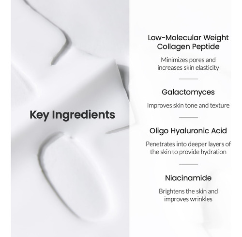 Galactomyces, Niacinamida, colágeno de baixo peso molecular, ácido oligohialurônico |