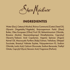 Water (eau), cetarethary alcohol, ricinus communis seed oil (ricin), (vegetable/vgtale), butyrospermum parkii (shea) butter* water (eau), cetarethary alcohol, butyrospermum parkii butternut (shea)* water ( eau), cetarethary alcohol, ricinus communis (ricin) seed oil, butyrospermum parkii (shea) butter*, olea europaea (olive) fruit oil, behentrimonium chloride, brassica alcohol, stearamidopropyl capryloyl sebacic acid copolymer, argania spinosa (argan) core oil, macrocystis pyrifera (kelp) extract, trehalose, diheptyl succinate, brassicile valinate sylate, polyquaternium_10, sodium chloride, lactic acid, calcium gluconate, sodium benzoate , triethyl citrate, caprylyl glycol, benzoic acid, fragrance (perfume).