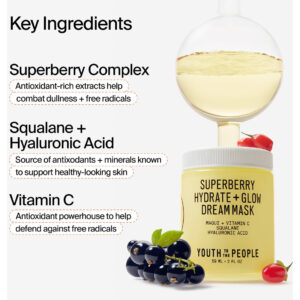 • Máscara Antioxidante Superberry – Esta máscara de cuidado da pele durante a noite contém uma mistura superberry de frutas ricas em antioxidantes, como maqui berry e figos da Índia, ajudando a combater os radicais livres e a aliviar os sinais de vermelhidão. O esqualano também aumenta a hidratação da pele sem obstruir os poros.