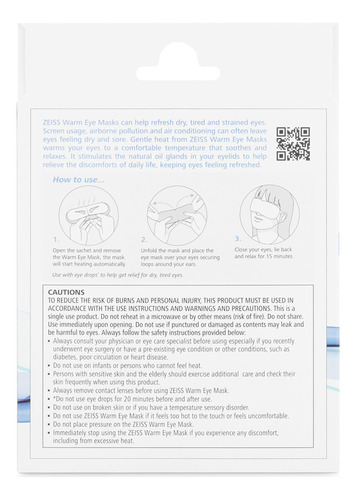 – Eficaz: as máscaras quentes ZEISS são aquecidas automaticamente até uma temperatura amena por pelo menos 15 minutos para ajudar a refrescar os olhos secos.