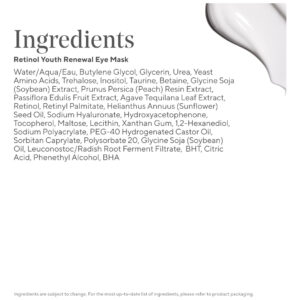 Máscaras oculares Murad Dr. Zion Retinol Youth Renewal Tapa-olhos antiderrapantes para linhas finas, rugas, pés de galinha e olhos inchados — Tiras de tratamento de absorção total, 5 pares — MÁSCARA EMBAIXO DOS OLHOS: dê à área inferior dos olhos um impulso instantâneo de retinol para reduzir visivelmente a aparência de linhas finas, rugas e pés de galinha, reduzir o inchaço e suavizar a pele para uma aparência revigorada – TIRAS ANTIDERRAPANTES: o extra almofadas grandes são feitas de biocelulose premium antiderrapante, usada para garantir que as máscaras permaneçam no lugar e, ao mesmo tempo, ajudam a aumentar a absorção dos ingredientes – TRATAMENTO COM RETINOL: A tecnologia Retinol Tri-Active fornece um retinóide de ação rápida para firmeza instantânea, um retinol de liberação prolongada para benefícios contínuos e um reforço de retinol para maximizar os resultados – INGREDIENTES ESSENCIAIS: O tratamento com retinol contém agave azul reafirmante, extrato de maracujá iluminador e purificador e a máscara de biocelulose é derivada da hidratação da água de coco – COMO USAR: Aplique as máscaras na parte inferior dos olhos área logo abaixo da linha dos cílios e acima da maçã do rosto; suavize suavemente e deixe por 15 minutos; descasque e descarte as almofadas oculares e aplique qualquer produto restante