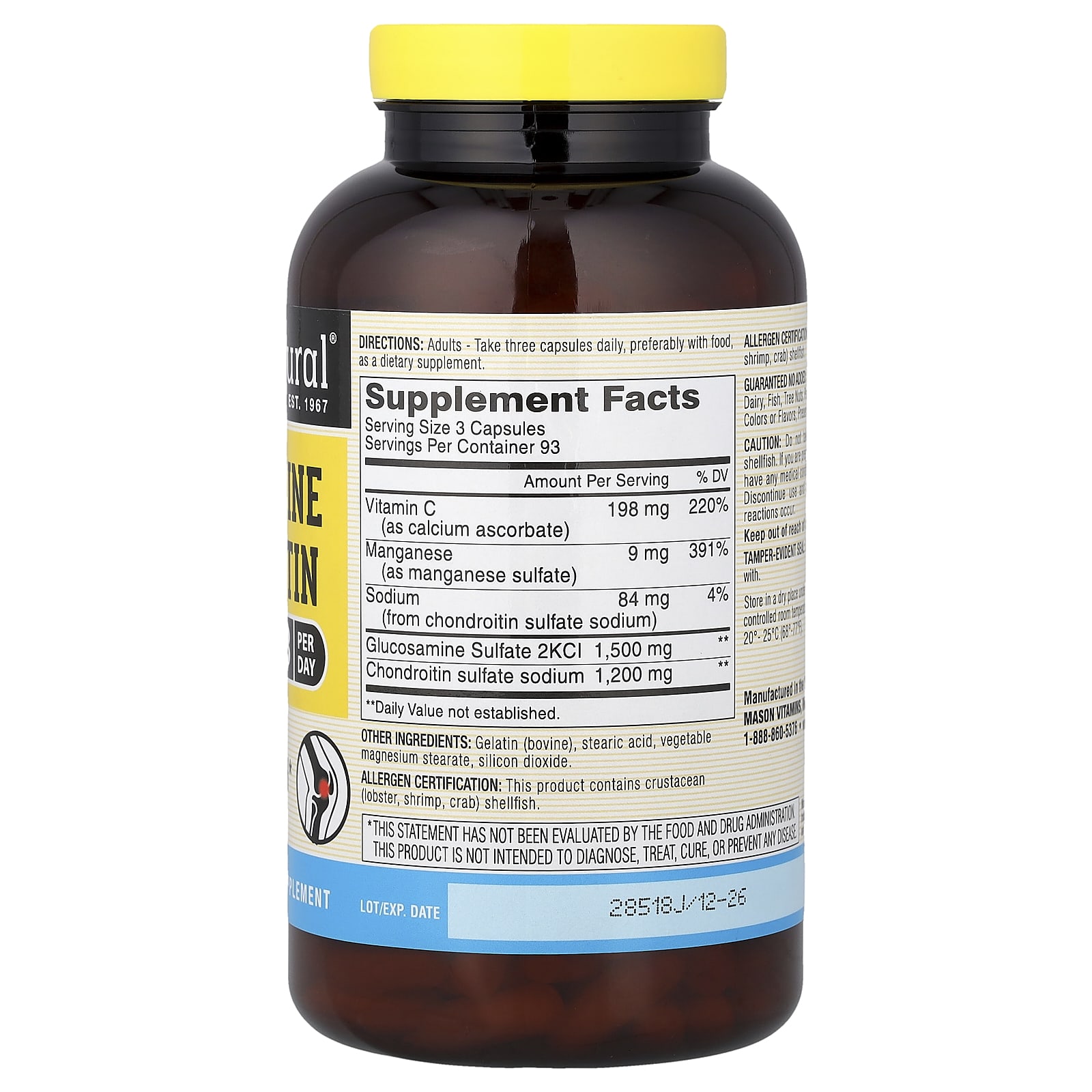 Mason Natural Glicosamina e Condroitina 280 Cápsulas – Mason Natural Suplementos Ossos, Articulações e Cartilagem Fórmulas de Glucosamina.
