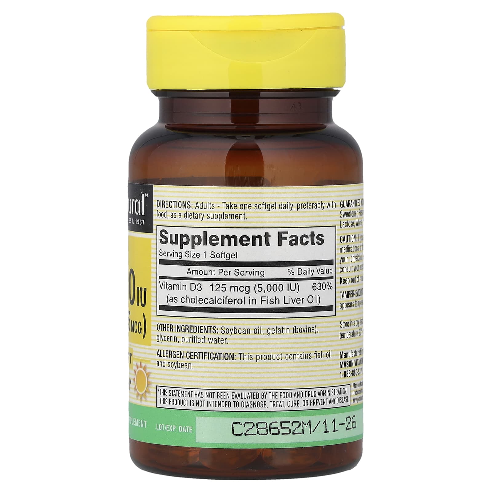 Mason Natural Vitamina D3 125 mcg (5.000 UI) 100 Cápsulas Softgel – Mason Natural Suplementos Vitaminas Vitamina D.