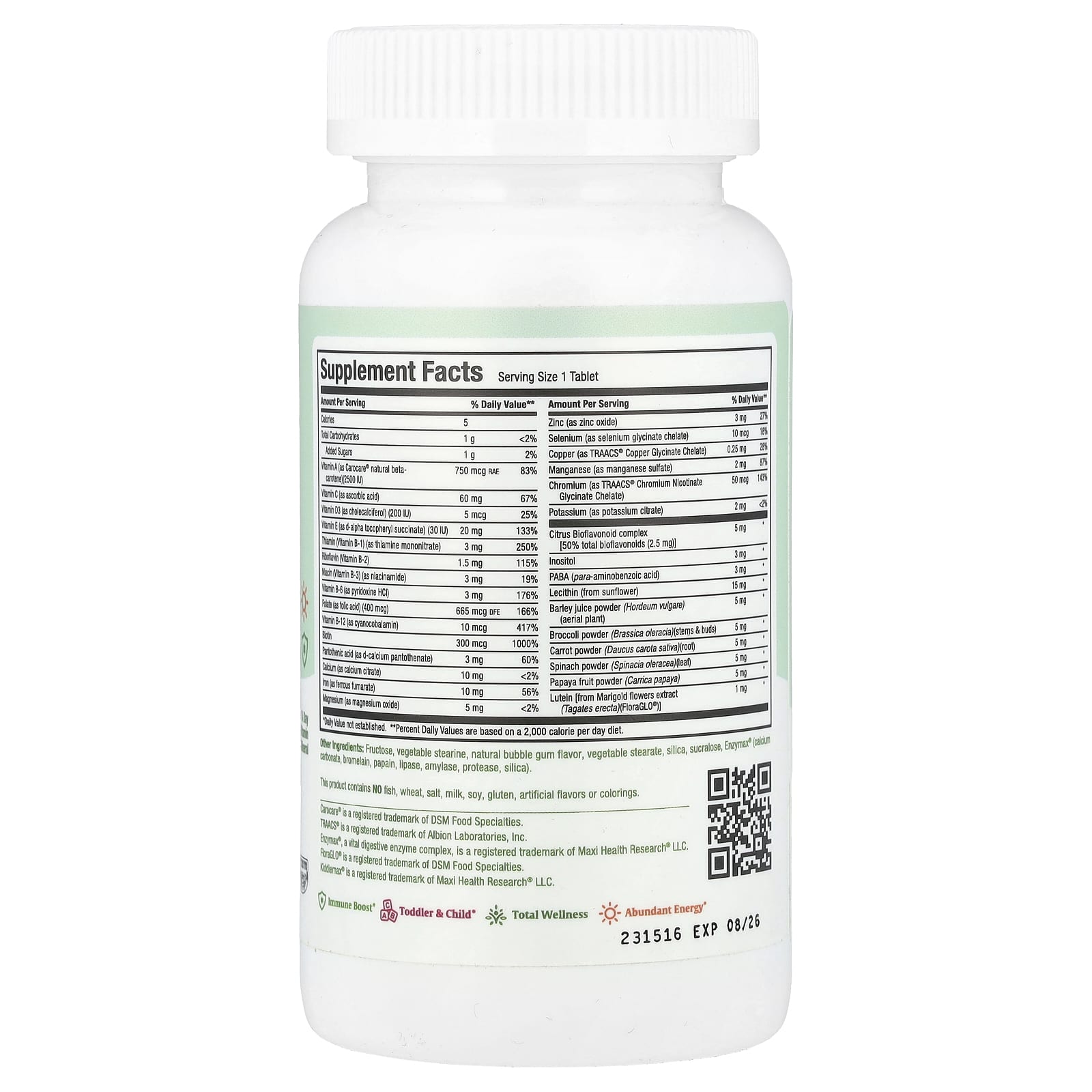 Em um mundo ideal, existem muitos suplementos derivados de plantas e frutas com que você alimentaria seus filhos, mas será que eles comem? O Kiddievite Mastigável inclui Grama de Cevada, Brócolis em pó, Cenoura em pó, Bioflavonoide Cítrico, Lecitina (de soja), calêndula Biolut™ extrato de flores silvestres, extrato de flores de calêndula Biolut™, Trans-zeaxantina, mamão em pó e espinafre em pó.