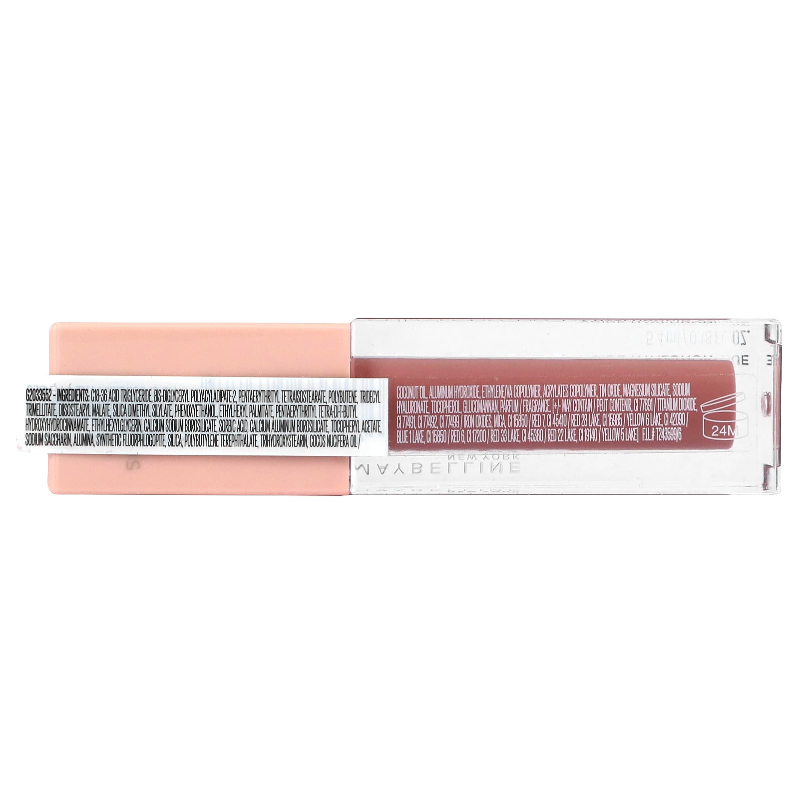 Triglicerídeos ácidos C18-36, bis-diglyceryl polyacyladipate-2, pentaerythrityl tetraisostearate, polybutene, tridecyl trimellitate, diisostearyl malate, silica dimethyl silylate, fenoxietanol, ethylhexyl palmitate, pentaerythrityl tetra-di-t-butyl hydroxyhydrocinnamate, ethylhexylglycerin, calcium sodium borosilicate, ácido sórbico, calcium aluminum borosilicate, acetato de tocoferol, sacarina de sódio, alumina, synthetic fluorphlogopite, sílica, polibutileno tereftalato, trihydroxystearin, óleo de cocos nucifera / óleo de coco, hidróxido de alumínio, copolímero de etileno/va, acrylates copolymer, óxido de estanho, silicato de magnésio, hialuronato de sódio, tocoferol, glucomannan, fragrância [+/- pode conter: ci 77891 / dióxido de titânio, CI 77491, CI 77492, CI 77499/óxidos de ferro, mica, ci 15850 / vermelho 7, CI 45410 / vermelho 28 lago, CI 15985 / amarelo 6 lago, CI 42090 / azul 1 lago, ci 15850 / vermelho 6, CI 17200 / Red 33 Lake, CI 45380 / vermelho 22 lake, CI 19140 / laca amarela].