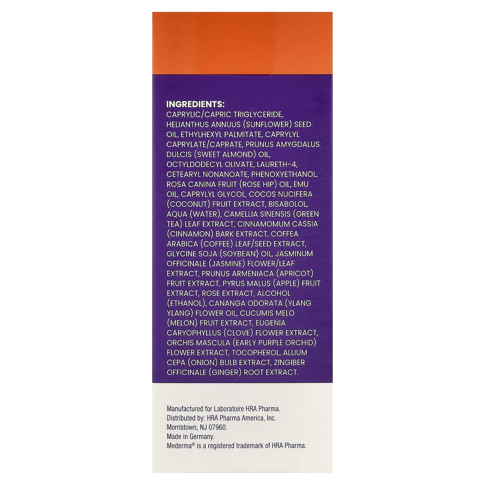 Caprylic/capric triglyceride, óleo da semente de Helianthus annuus (girassol), ethylhexyl palmitate, caprylyl caprylate/caprate, óleo de Prunus amygdalus dulcis (amêndoa doce), octildodecyl olivate, laureth-4, Nonanoato de Cetoestearílico, fenoxietanol, óleo da fruta de Rosa canina (rosa-mosqueta), óleo de emu, caprylyl glycol, extrato da fruta de Cocos nucifera (coco), bisabolol, aqua (água), extrato da folha de Camellia sinensis (chá verde), extrato da casca de Cinnamomum cassia (canela), extrato da folha/semente de Coffea arabica (cafe), óleo de Glycine soja (soja), extrato da flor/folha de Jasminum officinale (jasmim), extrato da fruta de Prunus armeniaca (damasco), extrato da fruta de Pyrus malus (maçã), extrato de rosa, álcool (etanol), óleo da flor de Cananga odorata (ylang-ylang), extrato da fruta de Cucumis melo (melão), extrato da flor de Eugenia caryophyllus (cravo), extrato da flor de Orchis mascula (orquídea roxa precoce), tocoferol, extrato do bulbo de Allium cepa (cebola), extrato da raiz de Zingiber officinale (gengibre).