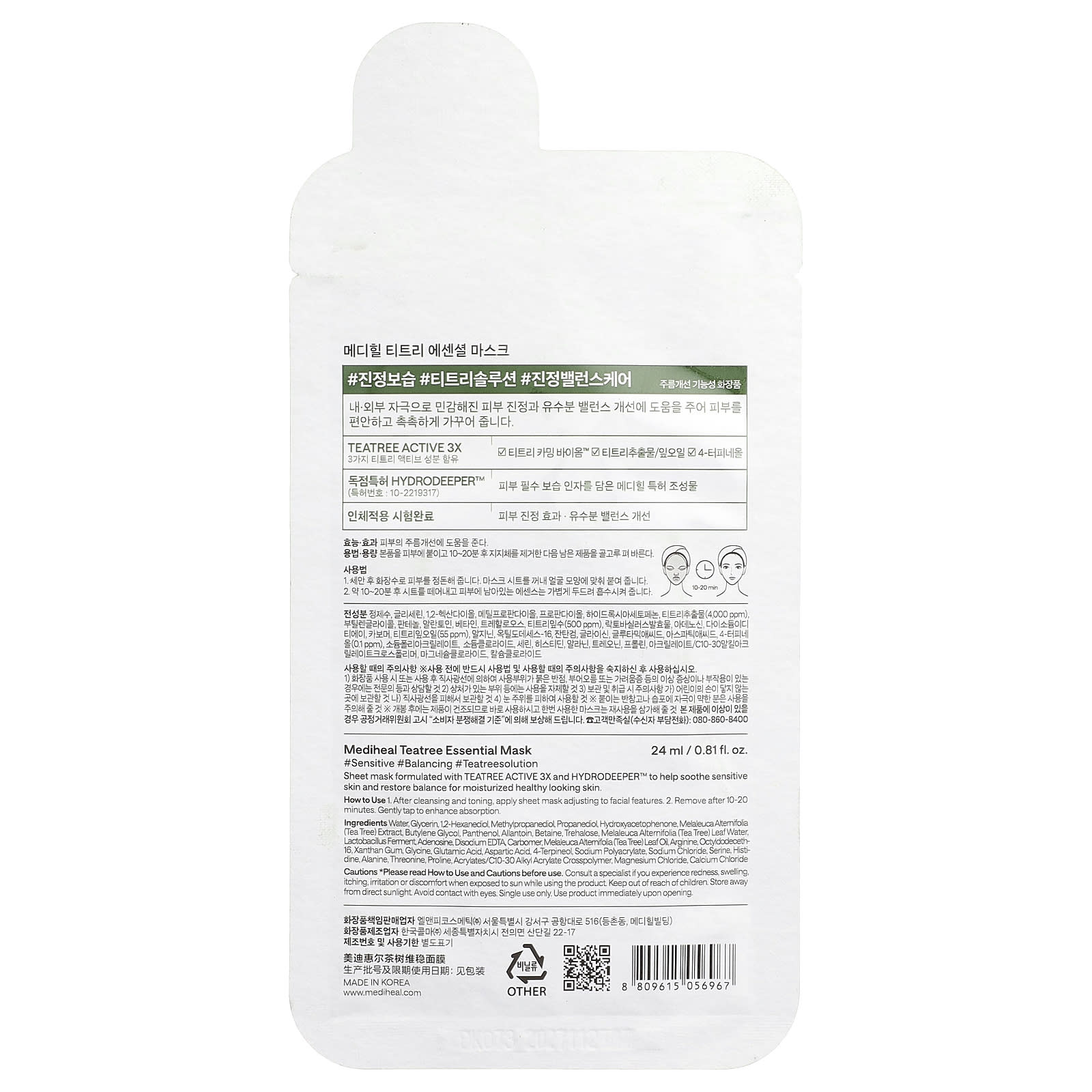 MEDIHEAL Máscara Essencial de Beleza da Árvore do Chá 1 folha 24 ml (081 fl oz) – MEDIHEAL Beleza Máscaras Faciais de Beleza Máscaras Faciais Máscaras em folha K-Beauty.