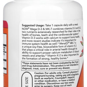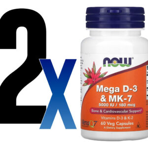 O Now Foods MEGA D-3 & MK-7 é um suplemento nutricional de alta potência que combina Vitamina D3 e Vitamina K2 em uma única cápsula vegetariana. Este frasco contém 60 unidades para uma administração conveniente;
